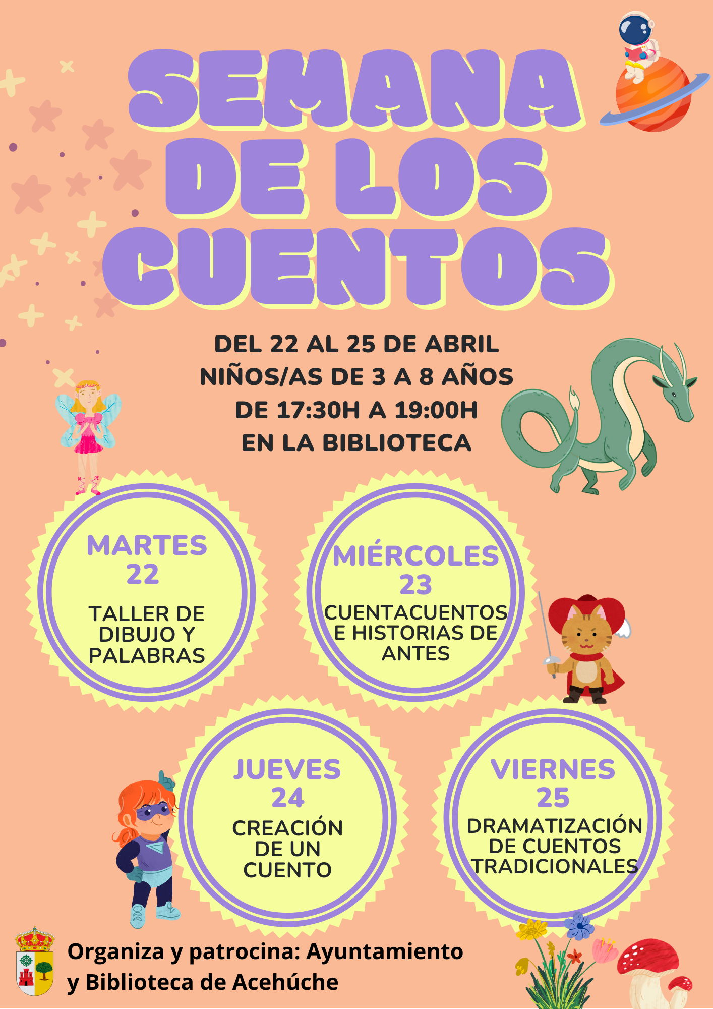 SEMANA DE LOS CUENTOS2025-04-17 17:00:00Info GeneralSE ADJUNTA CARTEL DE LA SEMANA DE LOS CUENTOS QUE SE CELEBRARÁ EN LA BIBLIOTECA DE ACEHÚCHE DEL 22 AL 25 DE ABRIL.