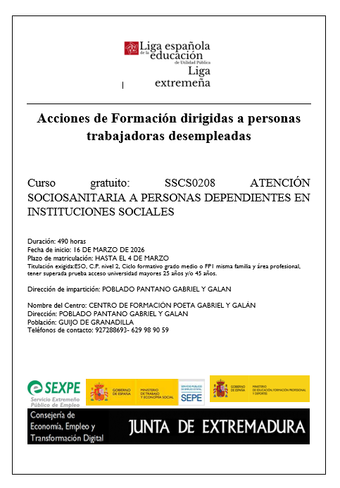 Se informa de que se va a desarrollar la formación "Atención socio sanitaria a personas dependientes en instituciones sociales" en el centro de formación del Poblado de Gabriel y Galán. El plazo de matriculación es hasta el 4 de marzo, y la fecha de inicio es el 16 de marzo. Más información en el teléfono de contacto de la fotografía adjunta.