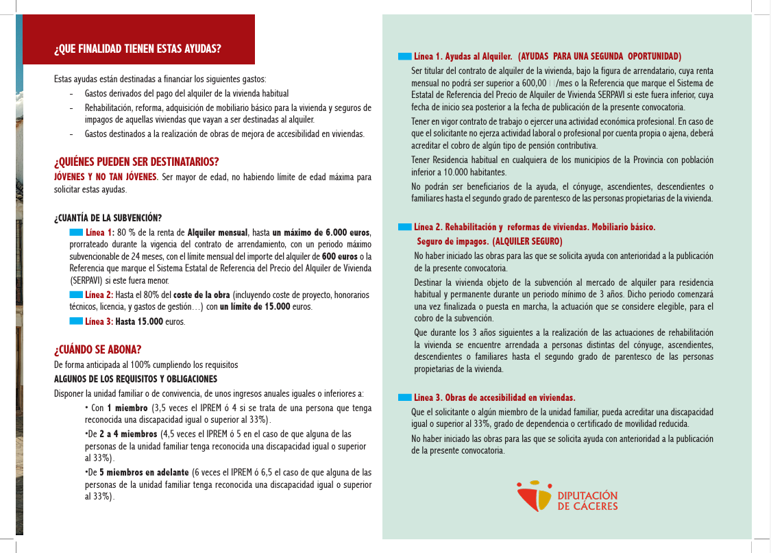 La diputación de Cáceres, con el programa "Más Vivienda", impulsa ayudas que están destinadas a financiar los siguientes gastos:
