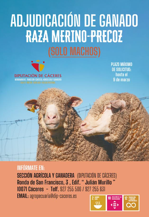 Se informa del inicio del procedimiento de adjudicación del ganado ovino de la raza Merino Precoz para Vida (SÓLO MACHOS), procedente de la finca "El Cuartillo" de Cáceres. Se trata de una ganadería que la Diputación de Cáceres cuida para que pueda llegar a los/as ganaderos/as de la provincia, significando que se han obtenido los máximos reconocimientos y premiso en las Ferias de Ganado de Zafra, Trujillo y Portugal.