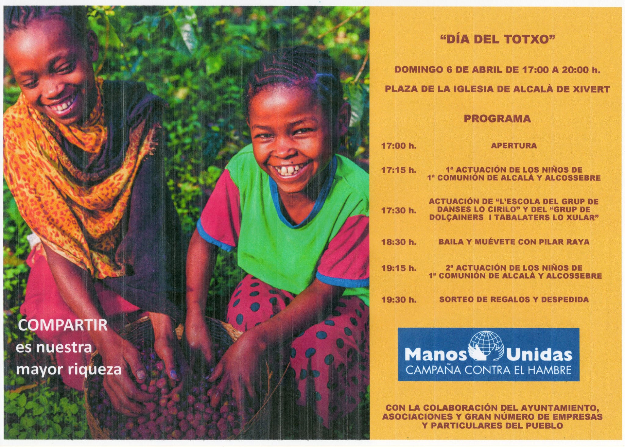 Manos Unidas invita a toda la población a participar y asistir a los actos del DÍA DEL TOCHO, que se celebrará el DOMINGO 6 DE ABRIL, de 17.00h a 20.00h, en la plaza de la Iglesia de Alcalà.
