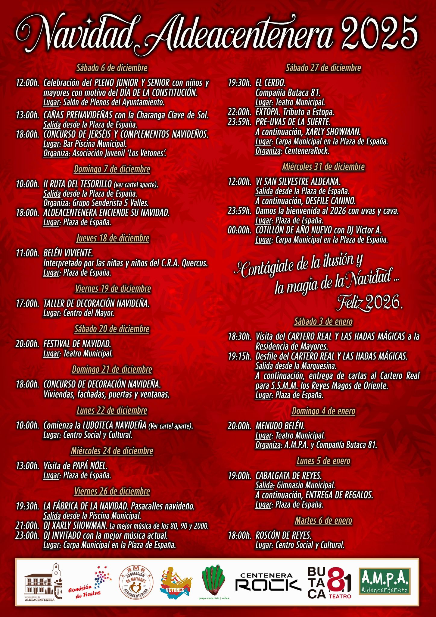 🌟 Las diferentes Concejalías del Ayuntamiento de Aldeacentenera, en colaboración con la Comisión de Fiestas, hemos preparado un amplio y variado programa de actividades culturales, deportivas, lúdicas y festivas para este mes de diciembre y enero de 2026, el cual adjuntamos. ¡Una agenda navideña pensada para disfrutar en familia, con amigos y para todas las edades!