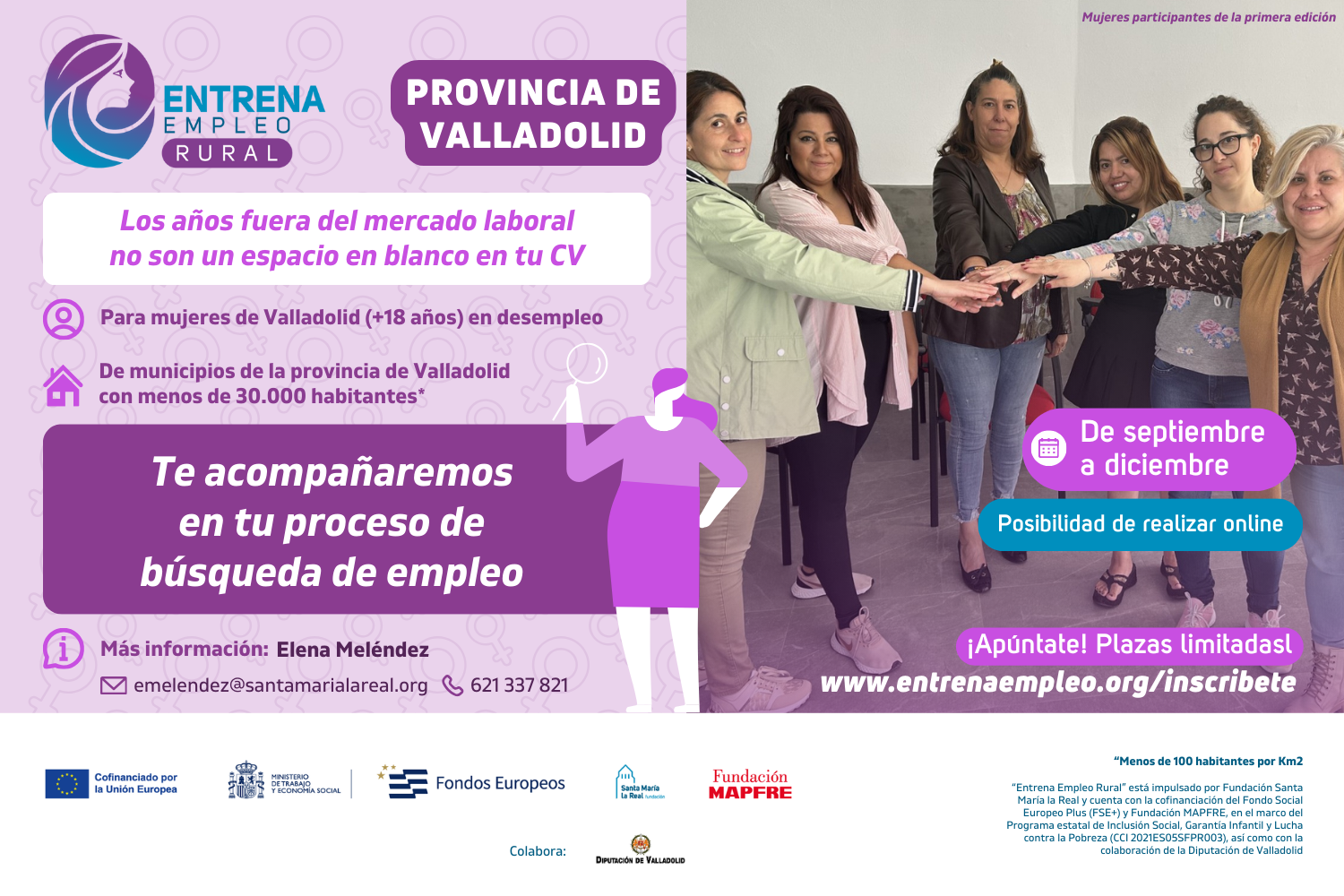 Más información en “Entrena Empleo Rural” regresa en septiembre para ayudar a mujeres en desempleo a reactivar su búsqueda de trabajo - Área de Empleo e Inclusión Social | Santa María La Real (areaempleofsmlr.es) y o en la web Entrena Empleo Rural