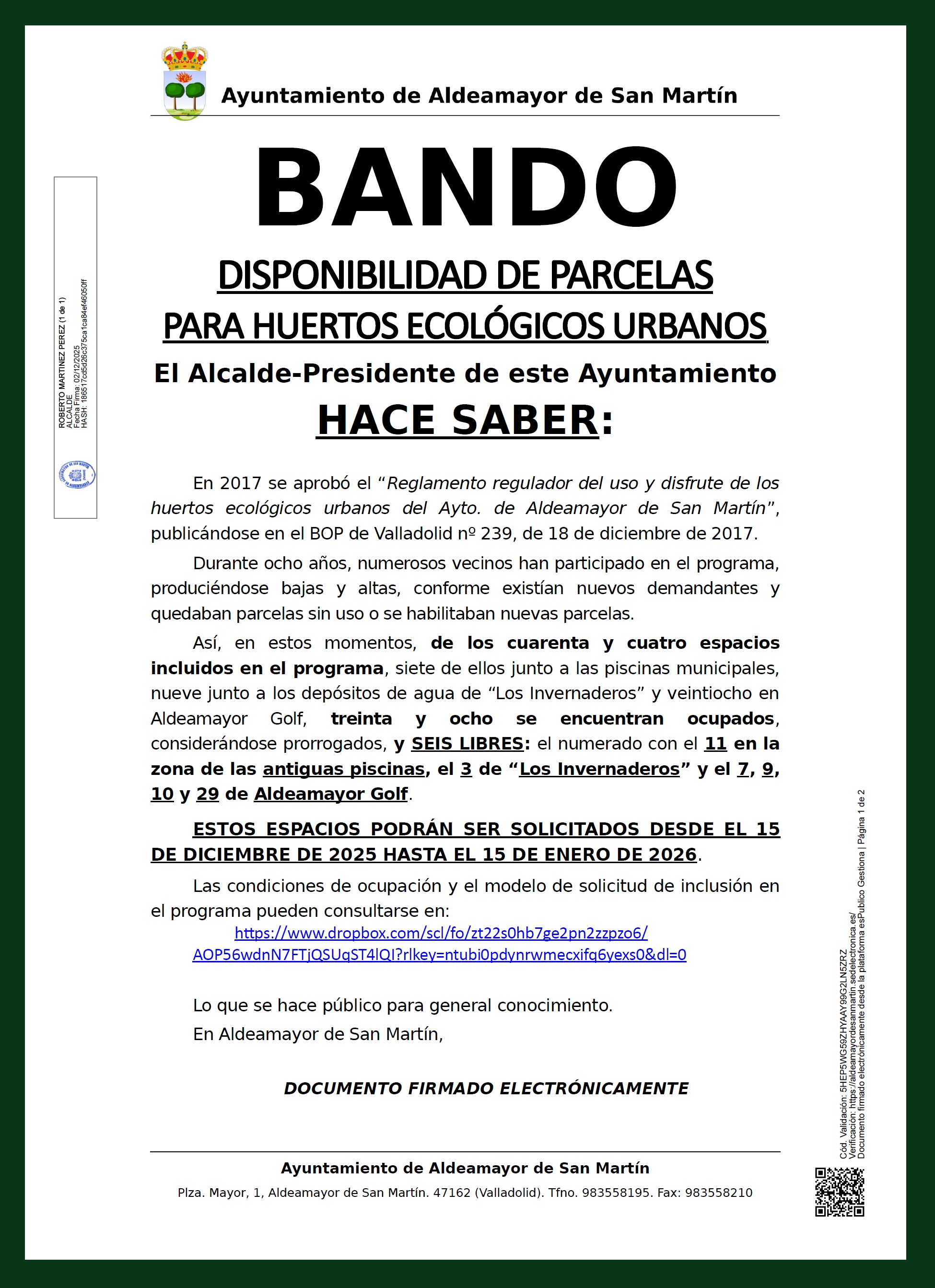 DISPONIBILIDAD DE PARCELAS PARA HUERTOS ECOLÓGICOS URBANOS EN 2026