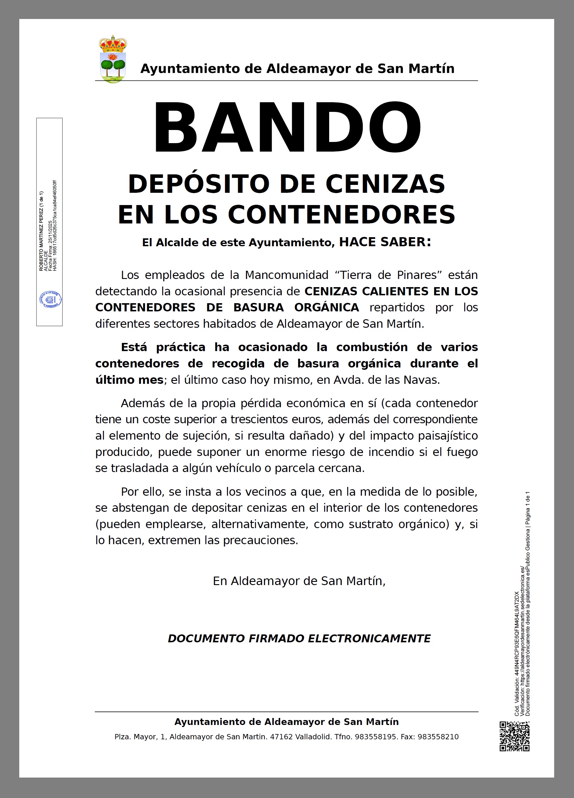 Los empleados de la Mancomunidad “Tierra de Pinares” están detectando la ocasional presencia de CENIZAS CALIENTES EN LOS CONTENEDORES DE BASURA ORGÁNICA repartidos por los diferentes sectores habitados de Aldeamayor de San Martín.