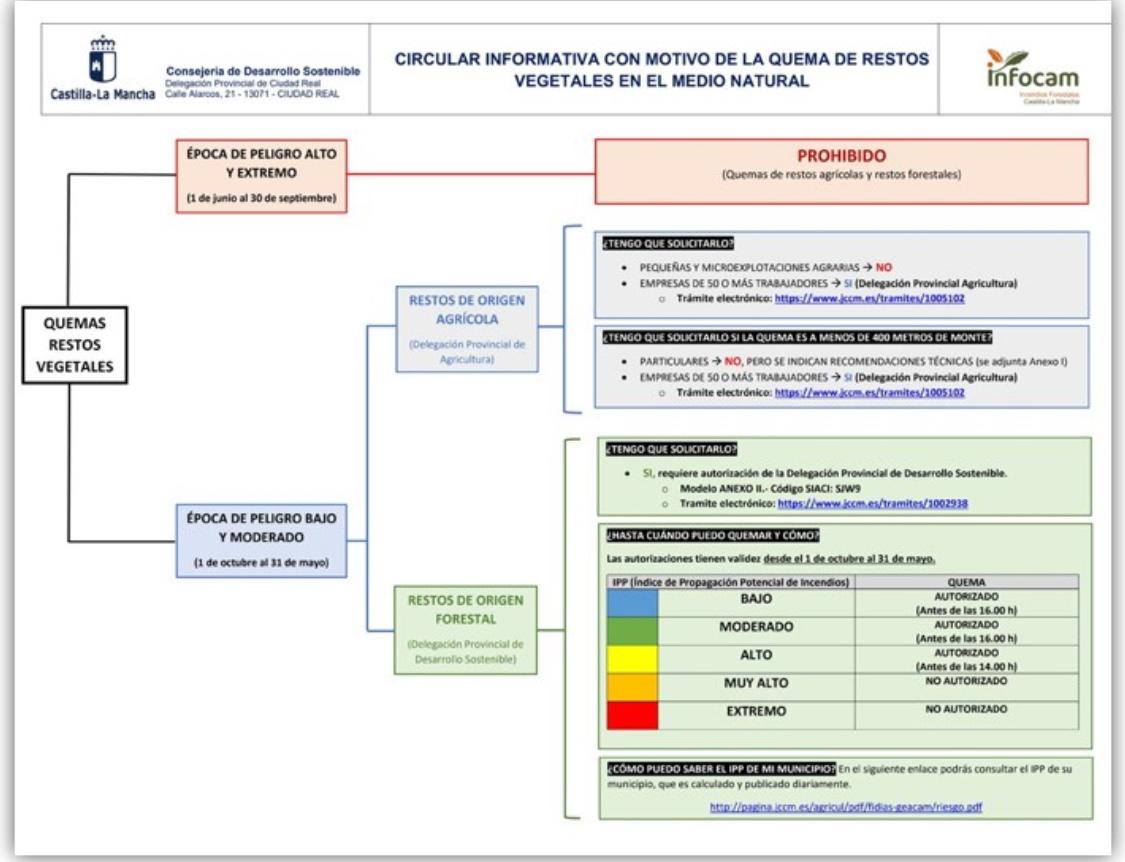 Conforme a la legislación vigente en materia de prevención de incendios forestales en Castilla-La Mancha, las quemas de restos agrícolas están prohibidas, durante las Épocas de Peligro Alto y Extremo (1 de junio al 30 de septiembre, con carácter general), dentro del territorio regional.