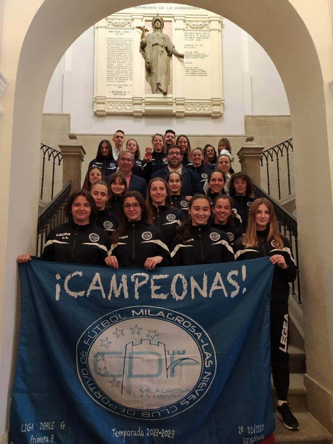 EL ALCALDE DE ÁVILA RECIBE AL CD MILAGROSA LAS NIEVES DE FÚTBOL FEMENINO QUE HAN CONSEGUIDO EL ASCENSO A PRIMERA DIVISIÓN REGIONAL2023-03-31 09:31:34DeporteEl alcalde de Ávila, Jesús Manuel Sánchez Cabrera, ha recibido en el Salón de Plenos del Ayuntamiento de Ávila al C.D. Milagrosa Las Nieves de fútbol, equipo que ha quedado campeón de la Liga Dobe G - Grupo B y, por lo tanto, consiguiendo el ascenso a Primera División Regional.