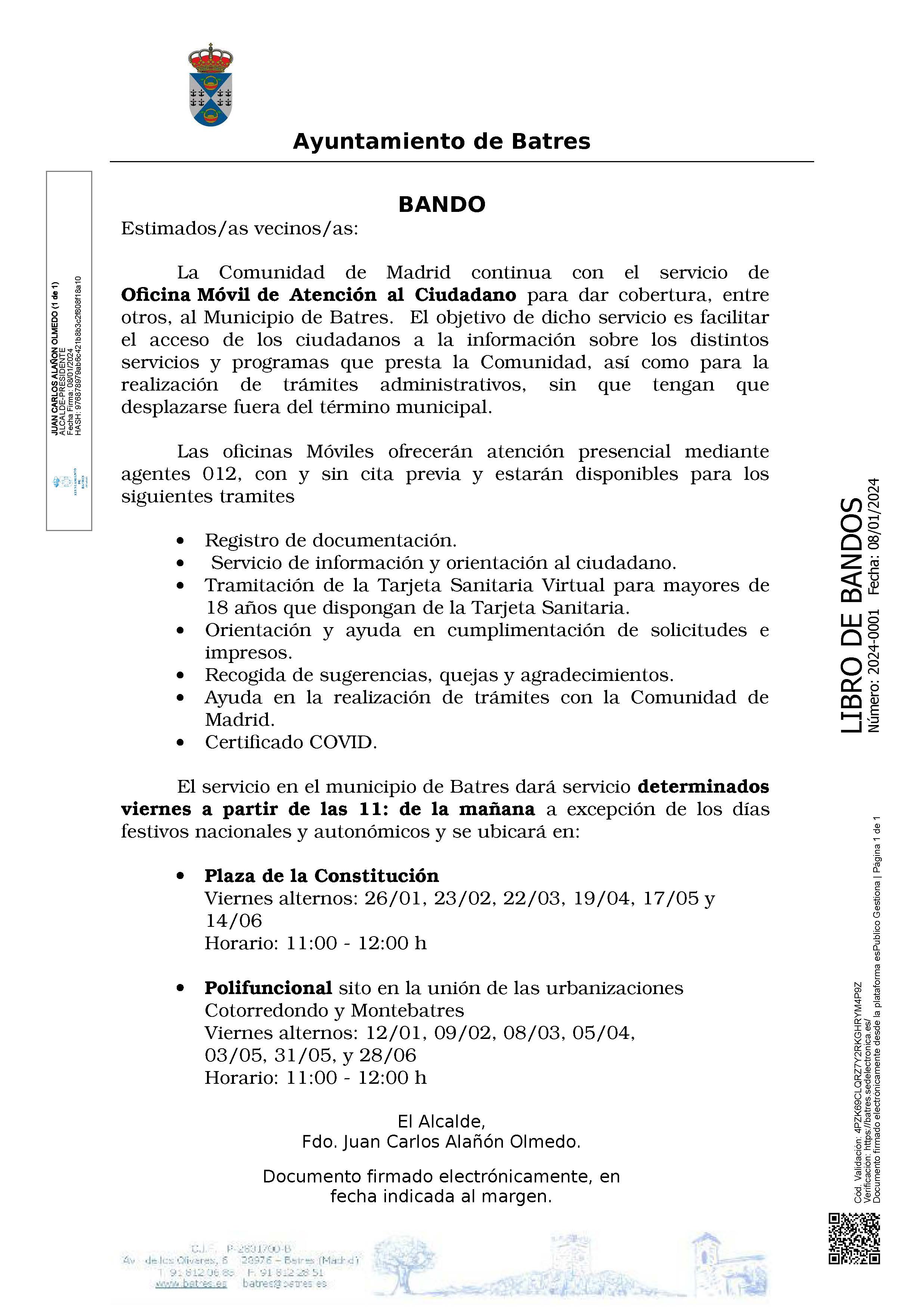 La Comunidad de Madrid continua con el servicio de Oficina Móvil de Atención al Ciudadano para dar cobertura, entre otros, al Municipio de Batres. El objetivo de dicho servicio es facilitar el acceso de los ciudadanos a la información sobre los distintos servicios y programas que presta la Comunidad, así como para la realización de trámites administrativos, sin que tengan que desplazarse fuera del término municipal.