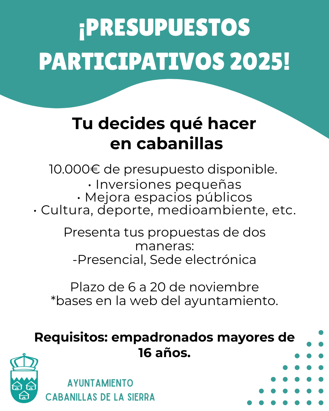 El Ayuntamiento de Cabanillas de la Sierra pone en marcha una nueva edición del Presupuesto Participativo, con una dotación de 10.000 € para que los vecinos y vecinas decidáis directamente en qué proyectos invertir parte del presupuesto municipal. 💡