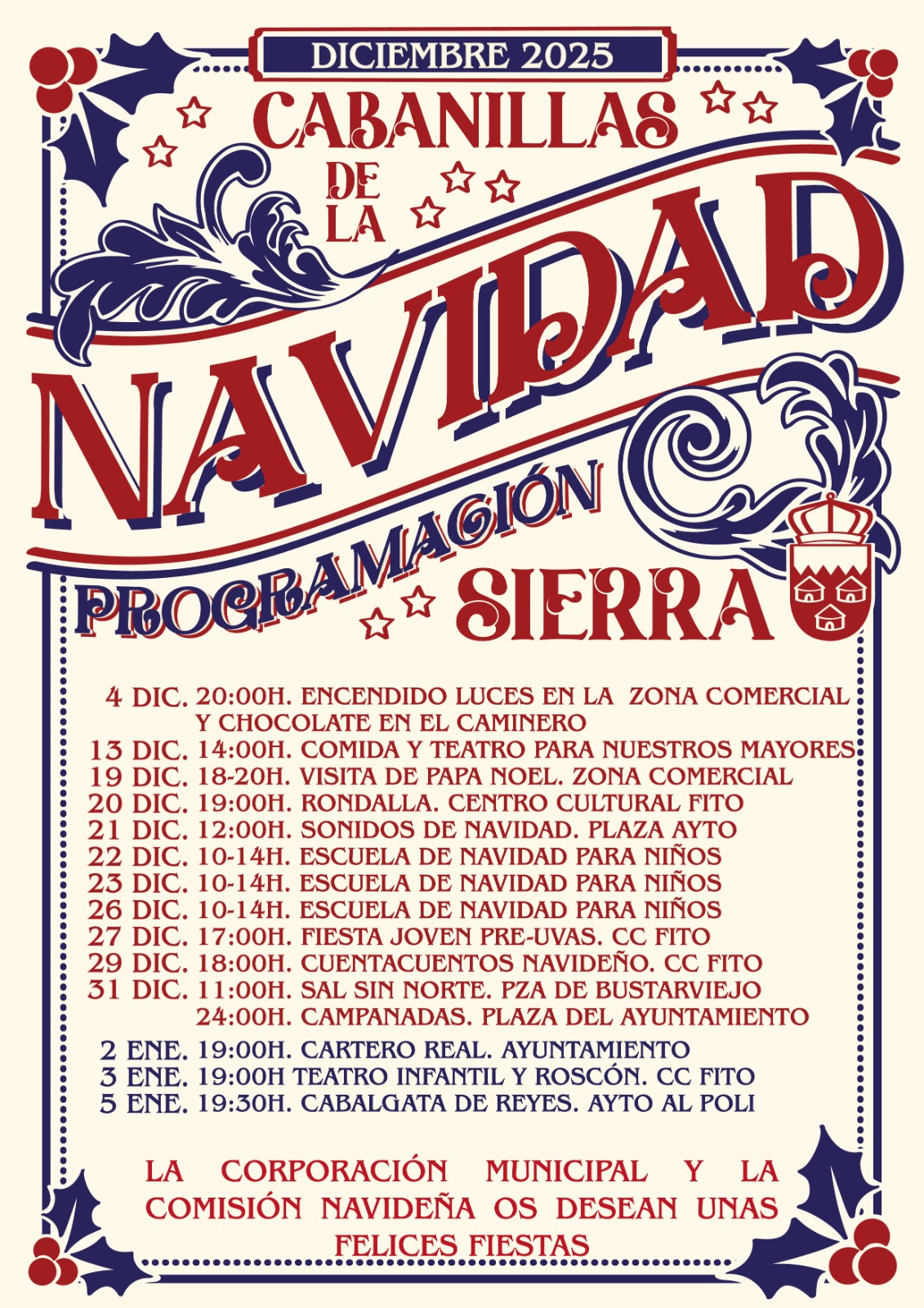 ¡La Navidad llega a Cabanillas de la Sierra! 🎄✨El Ayuntamiento de Cabanillas presenta la Programación de las Fiestas Navideñas 2025–2026, diseñada para fomentar la convivencia, la cultura y la participación de todos los vecinos.