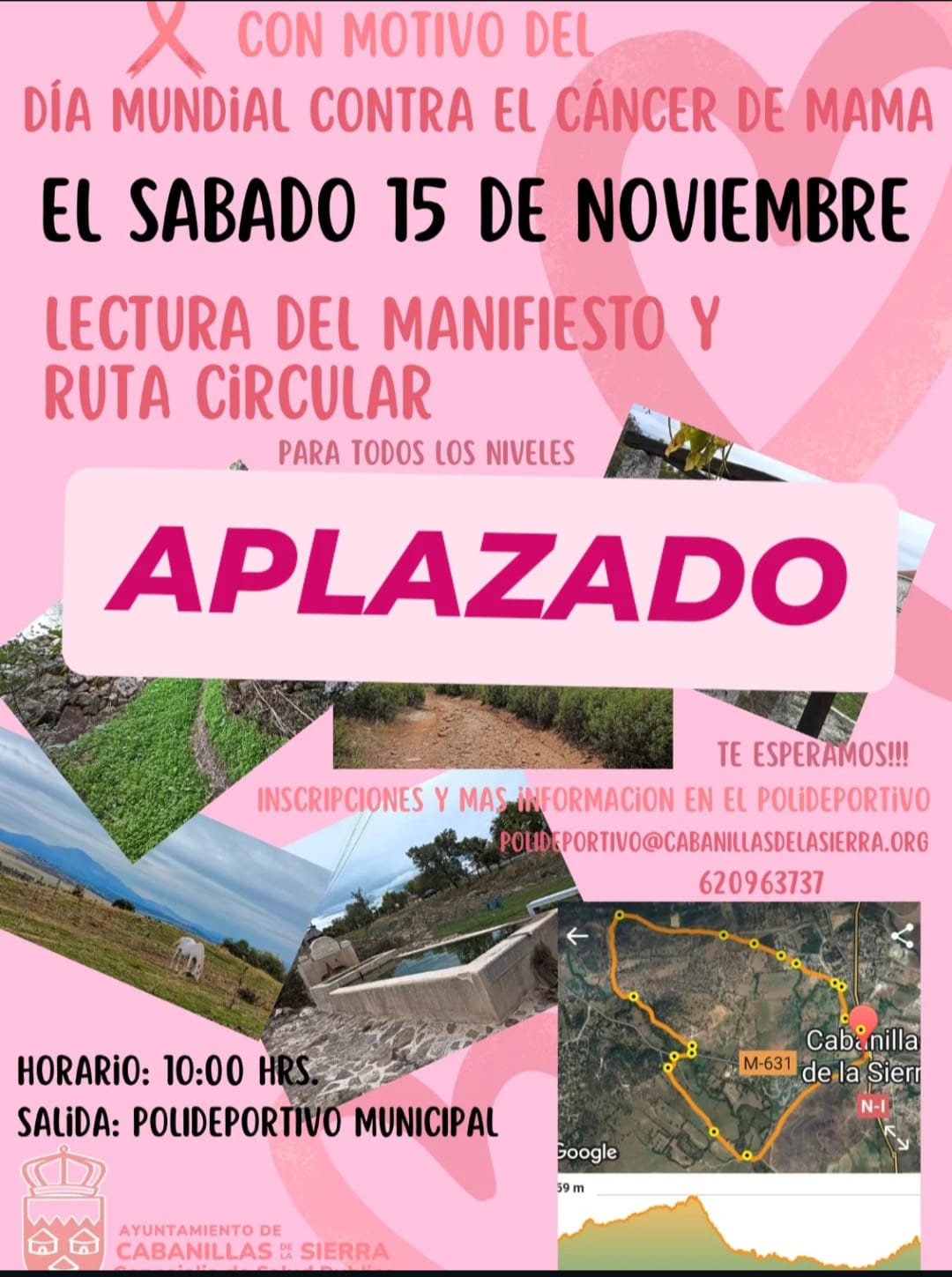 Lamentamos informar que la lectura del manifiesto y ruta circular con motivo del día mundial contra el cáncer de mama, prevista para el día 15 de noviembre, queda aplazada debido a las condiciones meteorológicas adversas que impiden realizar la actividad con seguridad.
