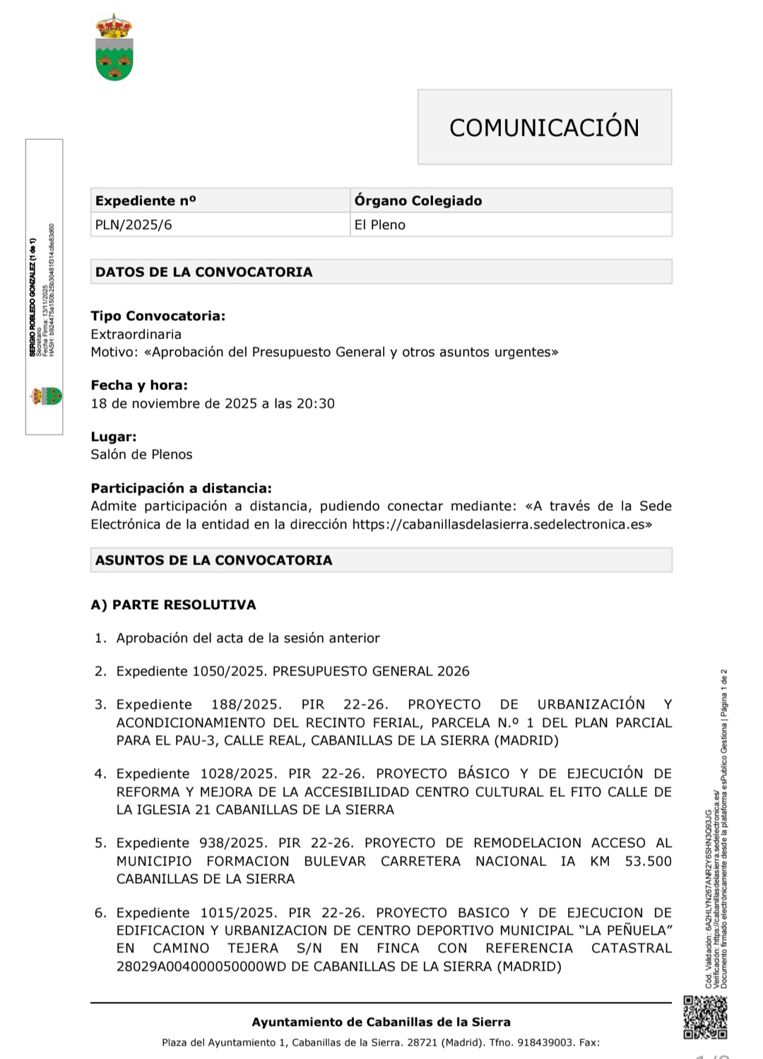 Se informa de la convocatoria a Pleno Extraordinario hoy martes día 18 de noviembre de 2025 a las 20,30h en el Salón de Plenos del Ayuntamiento.