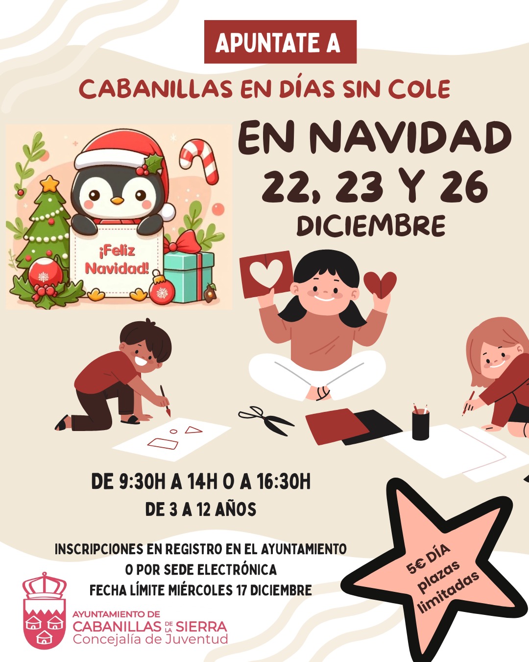 Los días 22, 23 y 26 de diciembre, coincidiendo con las jornadas no lectivas, el Ayuntamiento de Cabanillas de la Sierra organiza un campamento lleno de diversión, aprendizaje y espíritu navideño para que los peques disfruten a lo grande mientras las familias ganan tranquilidad y organización en estas fechas.