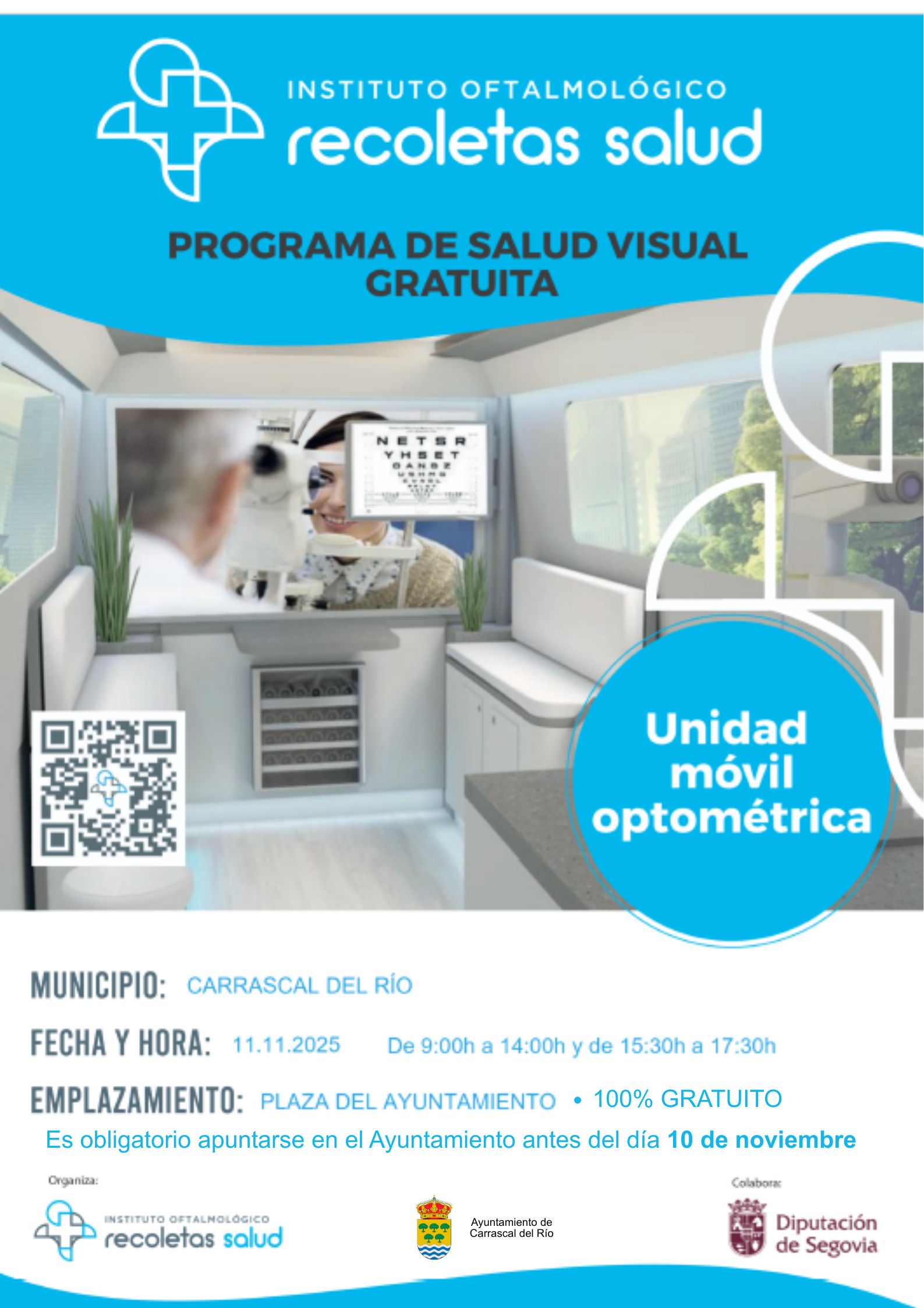 Un nuevo beneficio social que hemos conseguido para todos los Carrascaleñ@s en colaboración con el Instituto Oftalmológico Recoletos Salud y el área de Asuntos Sociales de la Diputación de Segovia. Una INSPECCIÓN VISUAL GRATUITA en la que se realizarán exploraciones optométricas de la función visual.