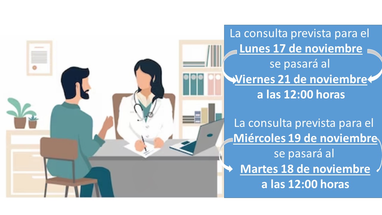 - La consulta prevista para el miércoles 19 de noviembre, se pasa al martes 18 de noviembre a las 12:00 h