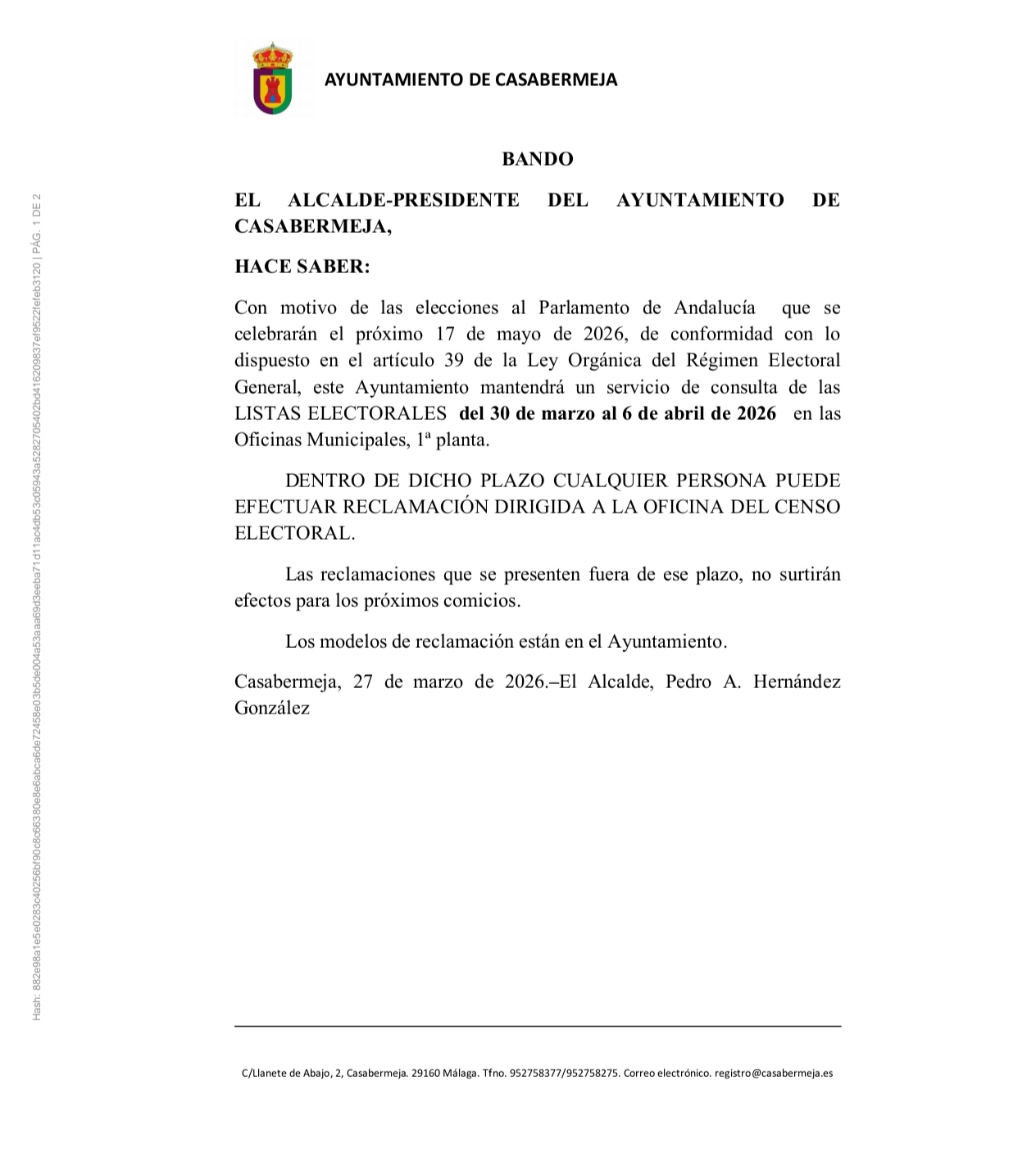 El Ayuntamiento de Casabermeja informa de que, con motivo de las próximas elecciones al Parlamento de Andalucía del 17 de mayo de 2026, se abre el plazo de consulta de las listas electorales.