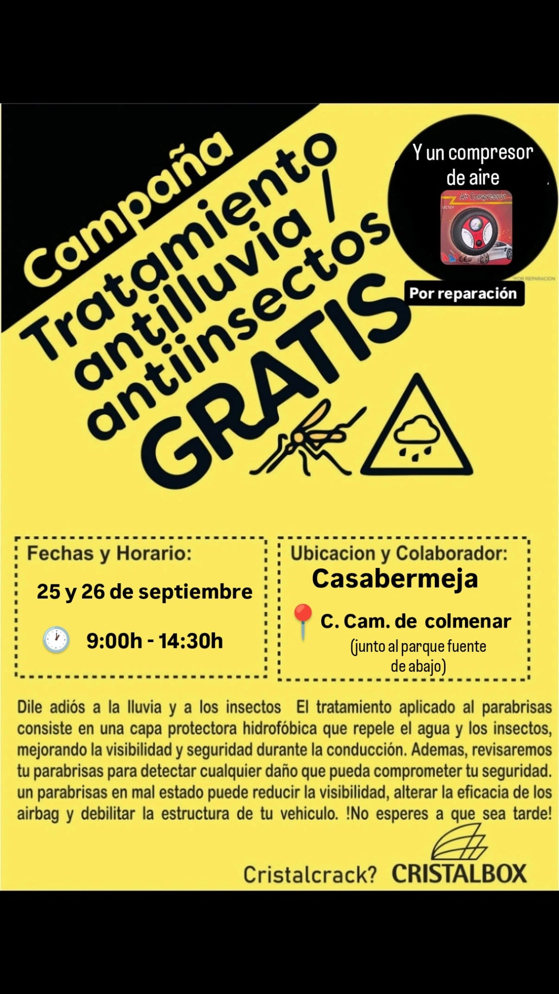ℹ️ Se llevará a cabo una campaña gratuita de tratamiento antilluvia y antiinsectos en parabrisas, que mejorará la visibilidad y seguridad durante la conducción.