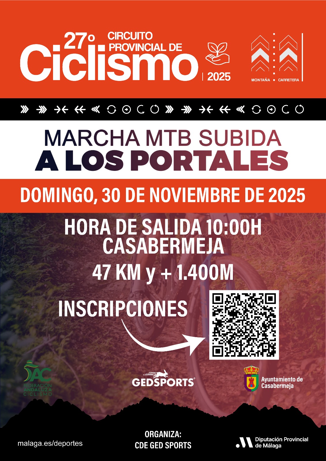 El próximo domingo 30 de noviembre, Casabermeja volverá a ser punto de encuentro para los amantes del ciclismo de montaña con la 27ª edición de la Marcha MTB Subida a Los Portales, incluida dentro del Circuito Provincial de Ciclismo 2025 🏁.