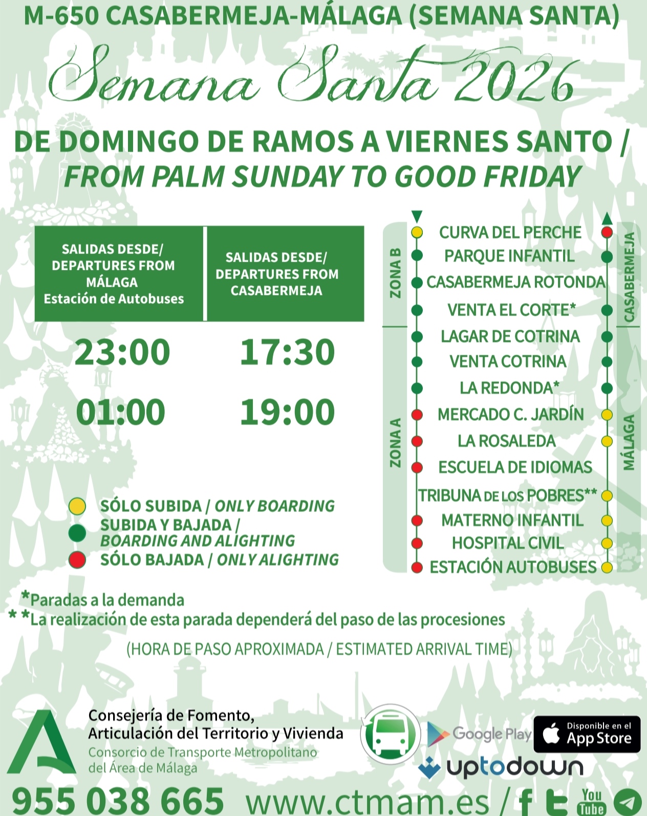 El Ayuntamiento de Casabermeja informa del servicio especial de la línea M-650 Casabermeja – Málaga, disponible de Domingo de Ramos a Viernes Santo.
