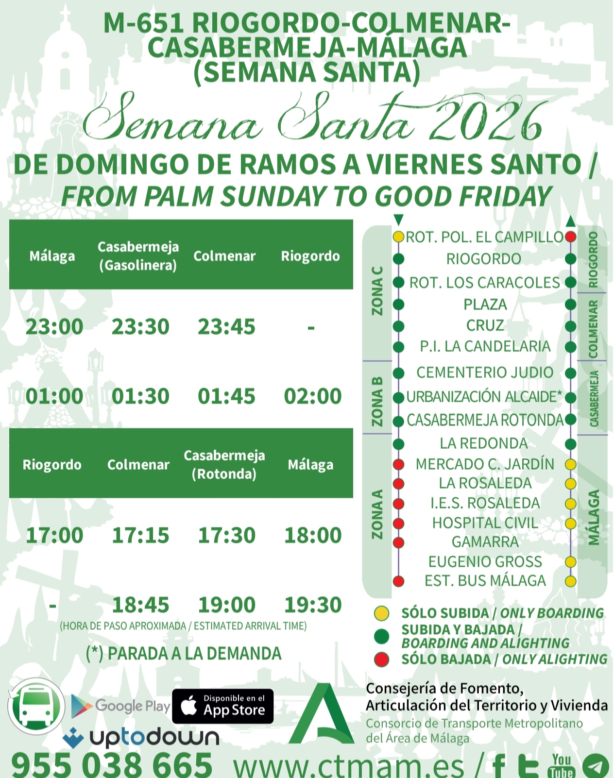 El Ayuntamiento de Casabermeja informa del servicio especial de la línea M-650 Casabermeja – Málaga, disponible de Domingo de Ramos a Viernes Santo.