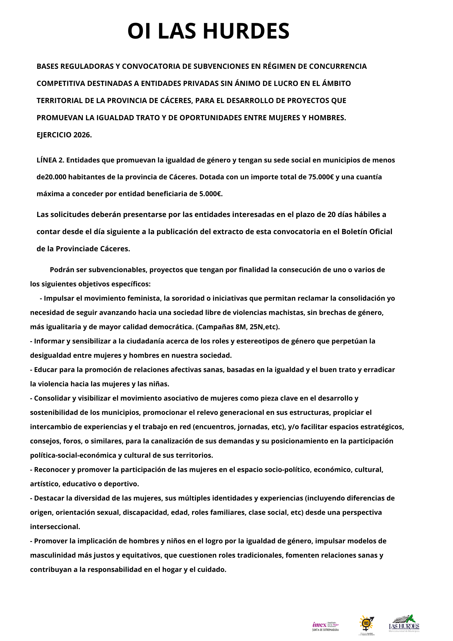 Se adjunta información sobre las subvenciones destinadas a asociaciones para el desarrollo de proyectos que promuevan la igualdad entre mujeres y hombres de la Diputación de Cáceres.