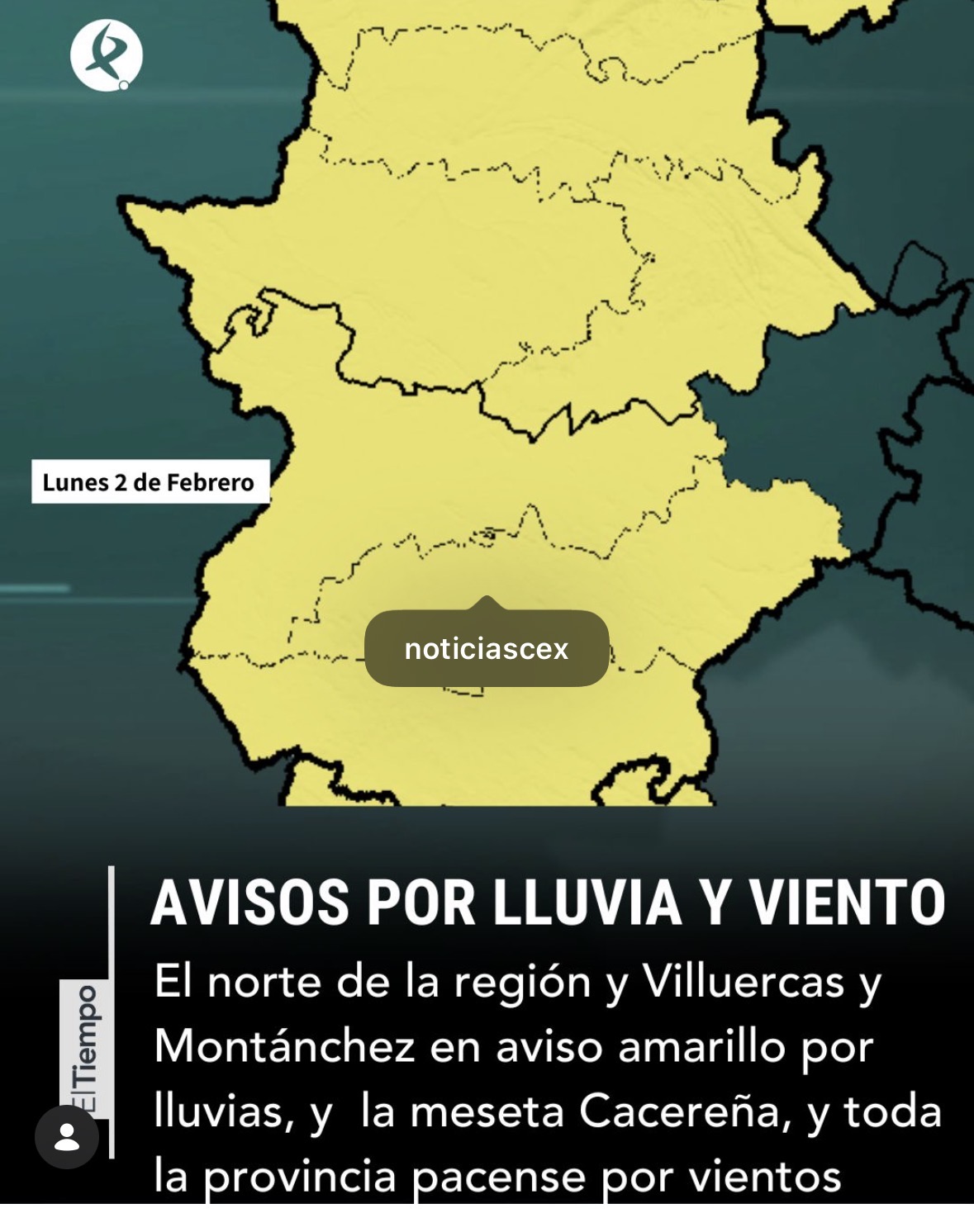 Ampliación Precipitación Acumulada Aviso AEMET FMA. Alerta Nivel Amarillo Lluvias. Precipitación acumulada en una hora: 15 mm.Cáceres (Norte, Villuercas y Montánchez).Desde 06:00 horas del 02/02/2026 hasta18:00 horas del 02/02/2026. Prob: 40-70%. Lluvias. Precipitación acumulada en 12 horas: 60 mm. Nivel: amarillo. Cáceres (Norte). Desde 18:00 horas del 01/02/2026. Hasta 18:00 horas del 02/02/2026. prob: 40-70%. mas info web 112 y AEMET.