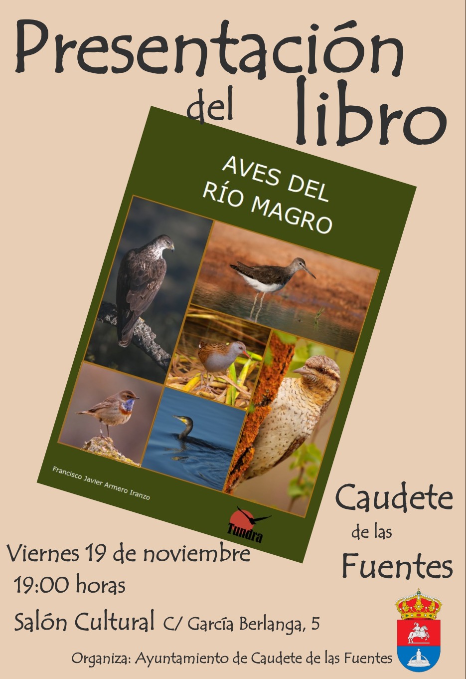 PRESENTACIÓN DE LIBRO "AVES DEL RIO MAGRO"2021-11-18 11:49:22CulturaEl Ayuntamiento informa que mañana viernes día 19 de Noviembre a las 19:00 horas en el Salón Cultural se realizará la Presentación de libro "AVES DEL RIO MAGRO" escrito por D. Francisco Javier Armero Iranzo, y que muestra el resultado de un exhaustivo estudio ornitológico llevado a cabo en el tramo alto de este curso fluvial del interior valenciano, desde su nacimiento en Caudete de las Fuentes hasta el embalse de Forata en Yátova, después de atravesar los términos municipales de Utiel y Requena.