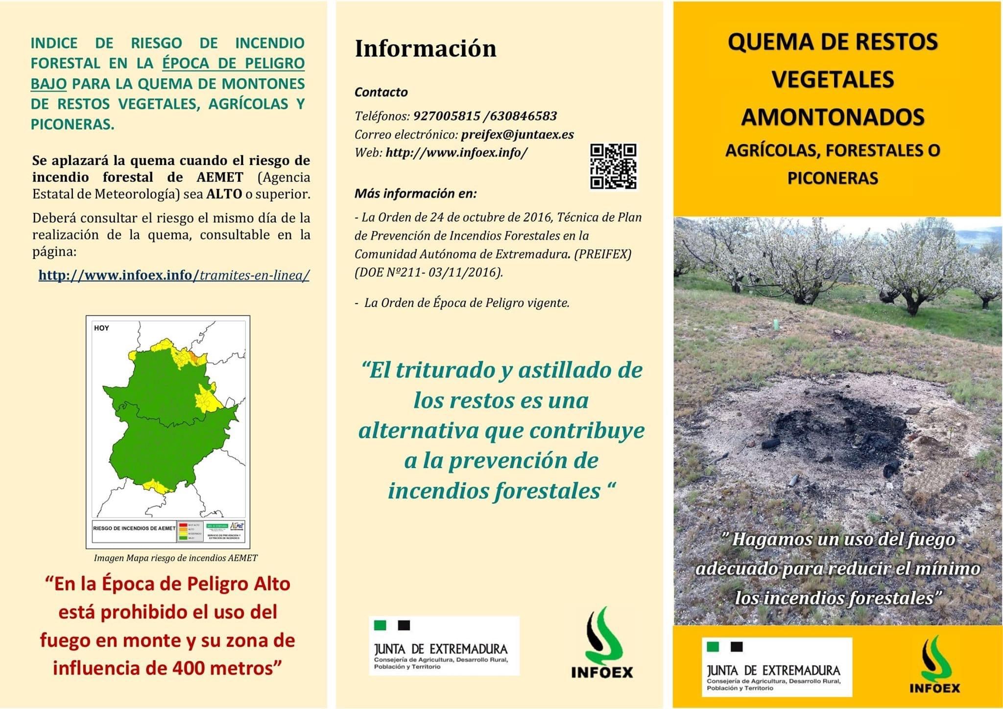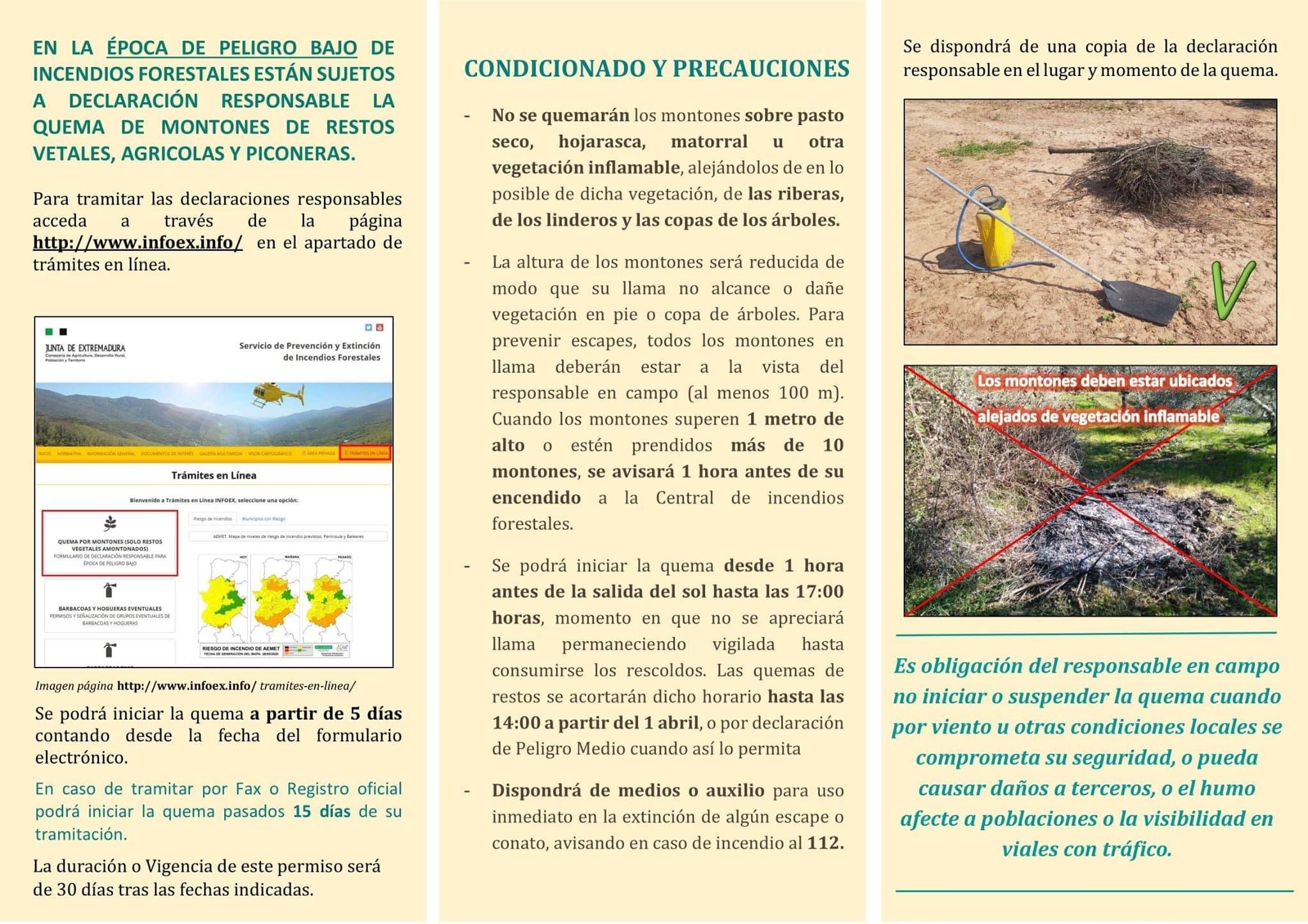 ➡️ Aprovechamos para informar que ya se pueden tramitar las solicitudes y declaraciones correspondientes a la Orden de peligro Bajo (PERMISOS DE QUEMA) en la web del INFOEX.
