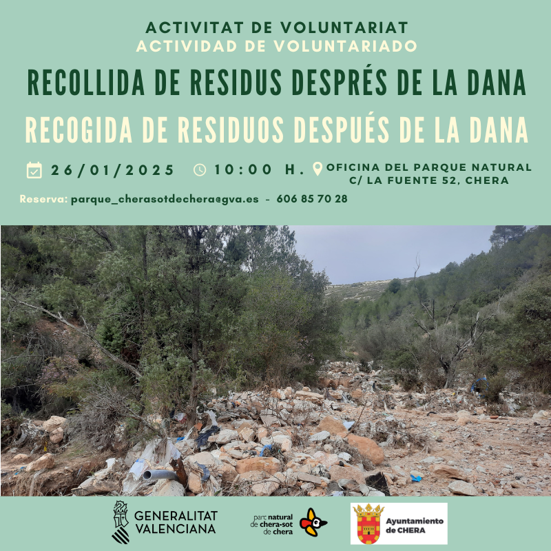 En Chera también hemos sufrido los efectos de esta riada, y además de los voluntariados de restauración de sendas que hemos empezado a llevar a cabo, también se van a realizar otro tipo de voluntariados como los de restauración del bosque de ribera, o el próximo que nos ocupa, de recogida de residuos que ha esparcido la fuerza del agua por las ramblas y barrancos.