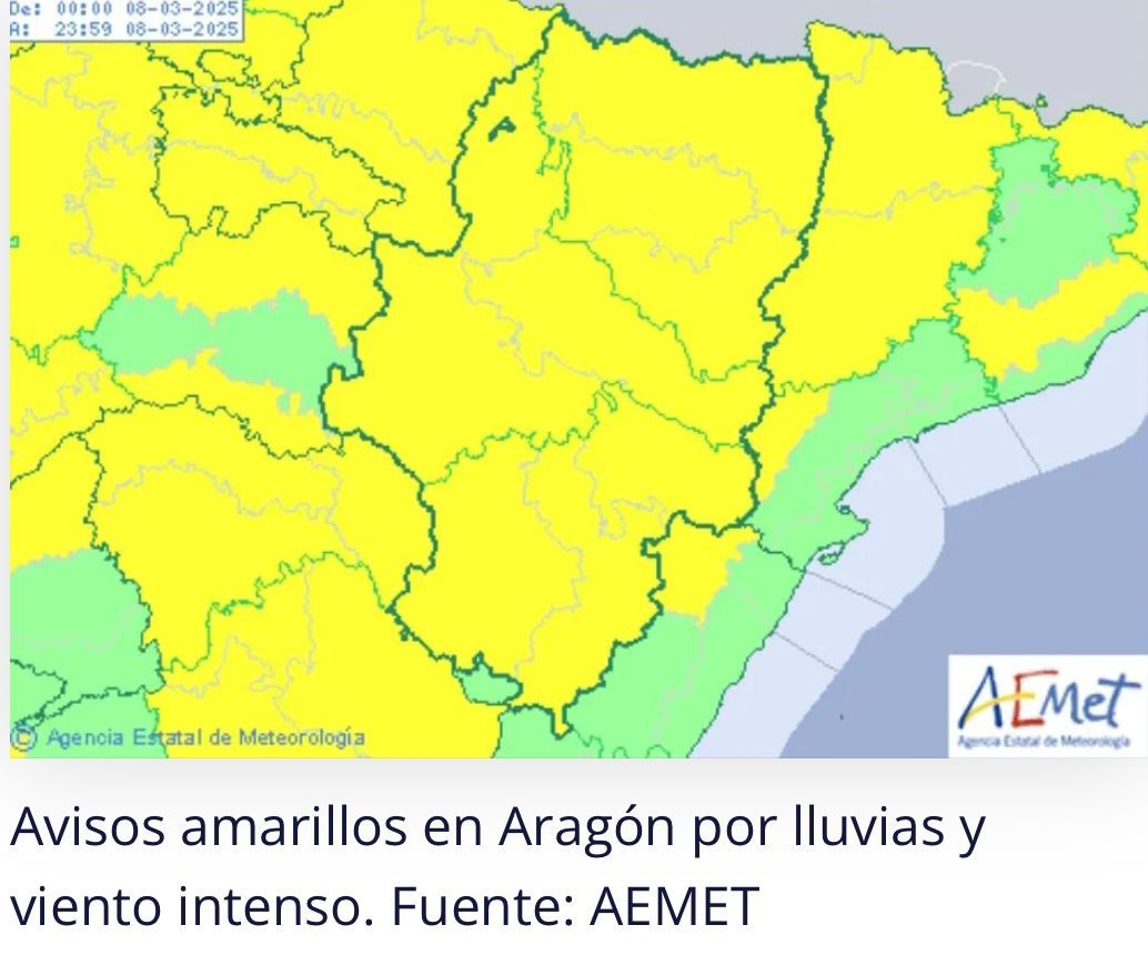 La Agencia Estatal de Meteorología (AEMET) mantiene activos los avisos amarillos en Aragón para mañana, sábado, 8 de marzo. En toda la comunidad hay aviso amarillo por acumulaciones de 15 mm en una hora y por rachas de viento de componente sureste que pueden alcanzar los 70-80 km/h.