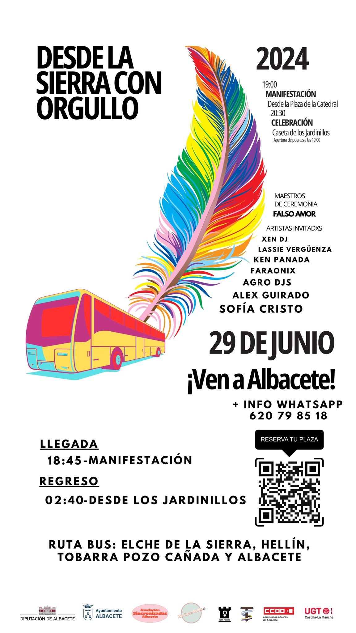 bus gratuito para ir mañana a la manifestación del Orgullo 2024 de Albacete2024-06-28 09:55:37Info Generalla Diputación financia en apoyo a la Asociación Sincronizadas un bus gratuito para ir mañana a la manifestación del Orgullo 2024 de Albacete y participar en las actividades programadas. El bus saldrá desde Elche de la Sierra y es necesario inscribirse a través de un formulario al que se accede por código QR.