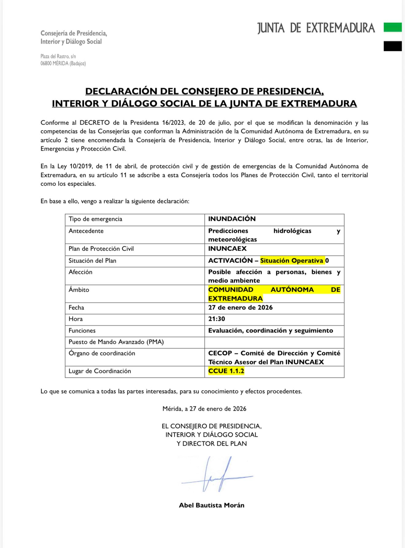 112 DE EXTREMADURA INFORMA DE ALERTA AMARILLA