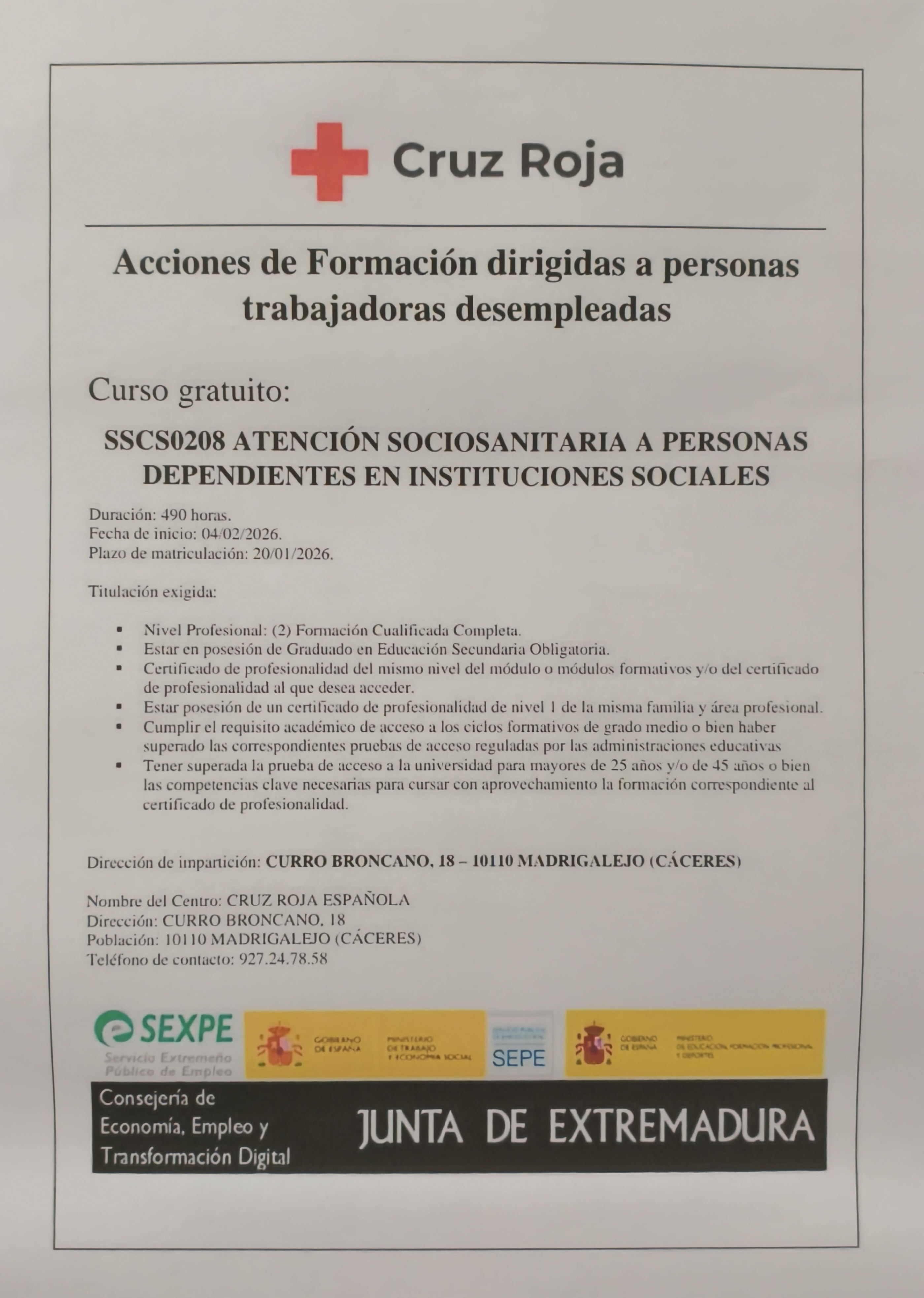 Lugar de impartición: En Madrigalejo, C/ Curro Broncano 18 (Cruz Roja)
