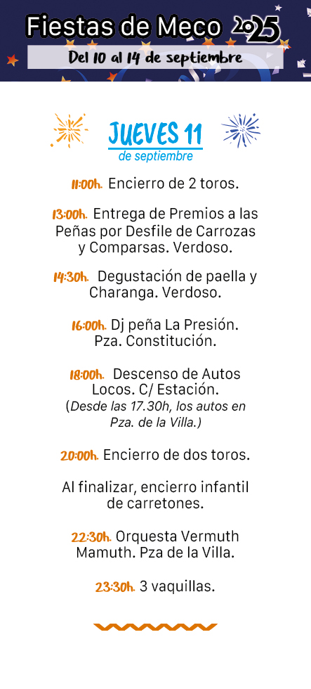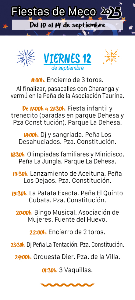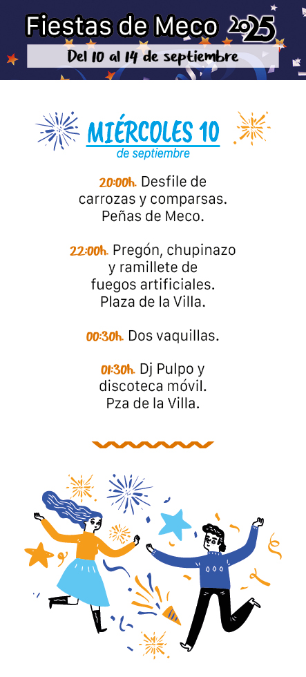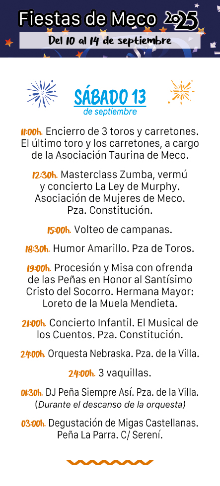 Del 10 al 14 de septiembre Meco festejará al Cristo del Socorro2025-09-01 08:27:00Info GeneralMúsica, encierros, actividades infantiles, descenso de autos locos,... las calles y plazas de Meco ultiman sus preparativos para dar luz verde, el miércoles 10 de septiembre, a las esperadas Fiestas en Honor del Santísimo Cristo del Socorro.