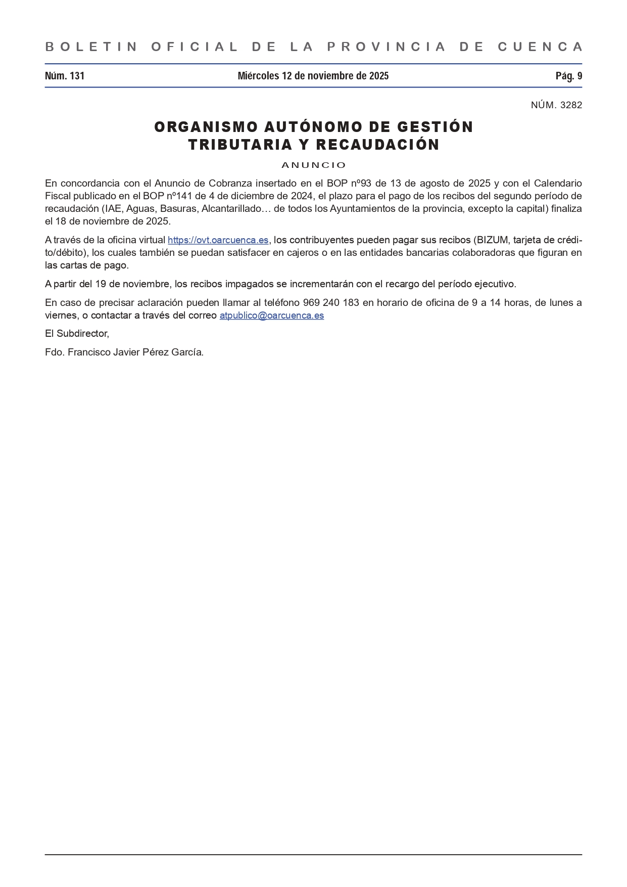 Se adjunta a este bando anuncio publicado hoy en el Boletín Oficial de la Provincia de Cuenca sobre el plazo para el pago de los recibos del segundo período de recaudación (IAE, aguas, basuras, alcantarillado...).