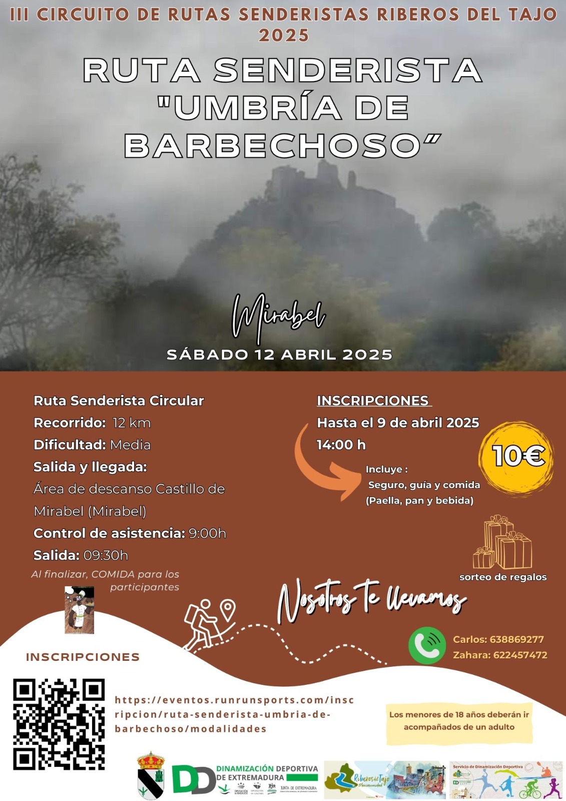 Ruta senderista "Umbría de Barbechoso".2025-04-03 13:00:00DeporteSe recuerda que el sábado 12 de abril se celebrará la ruta senderista "Umbría de Barbechoso" perteneciente al "III Circuito de rutas senderistas Riberos del Tajo".