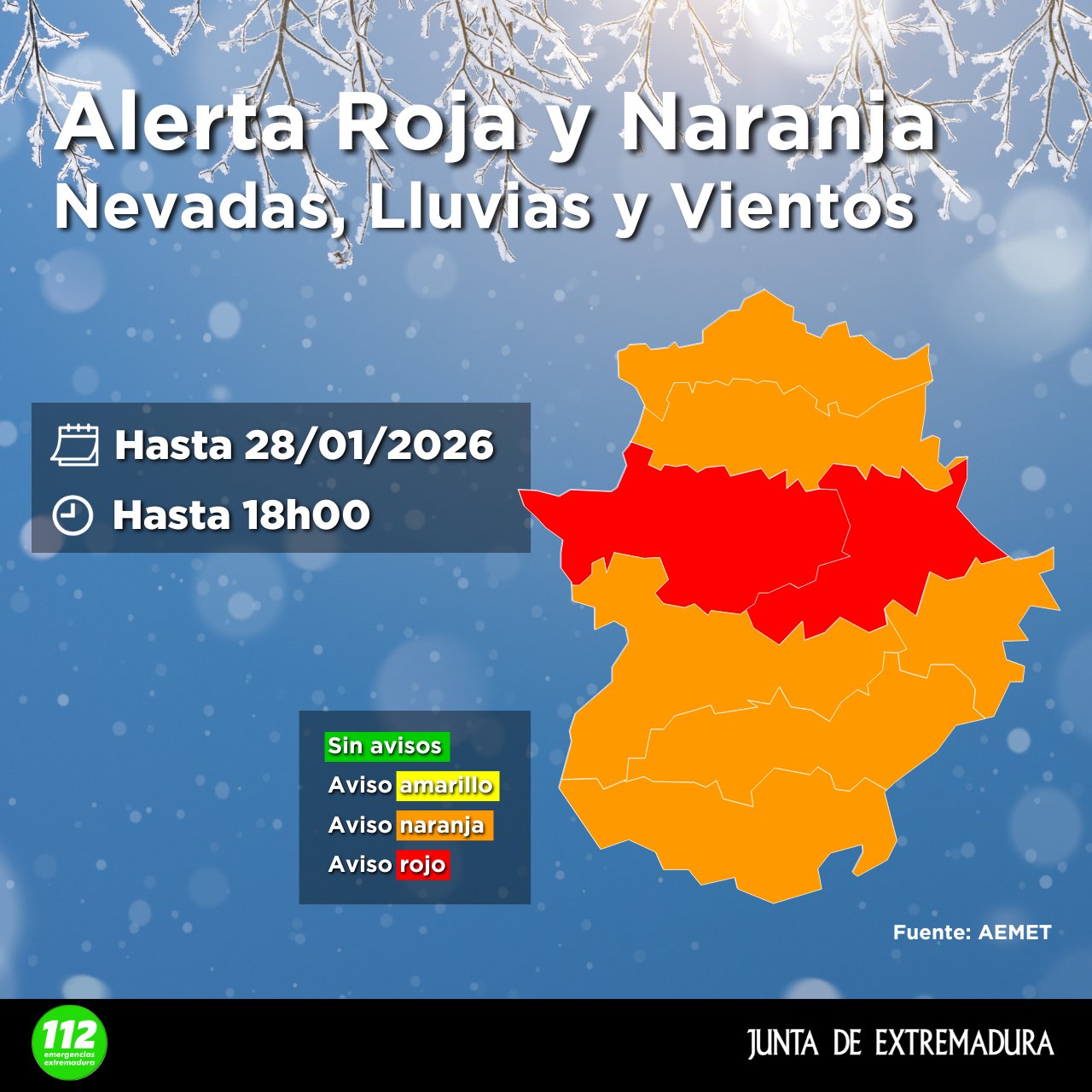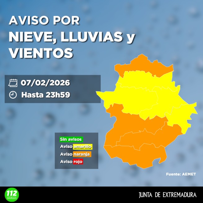 Ante los avisos meteorológicos amarillo y naranja activados en Extremadura por lluvias intensas, fuertes rachas de viento y posibilidad de nieve, y debido a la imposibilidad de garantizar la seguridad en los desplazamientos, la Consejería ha comunicado: