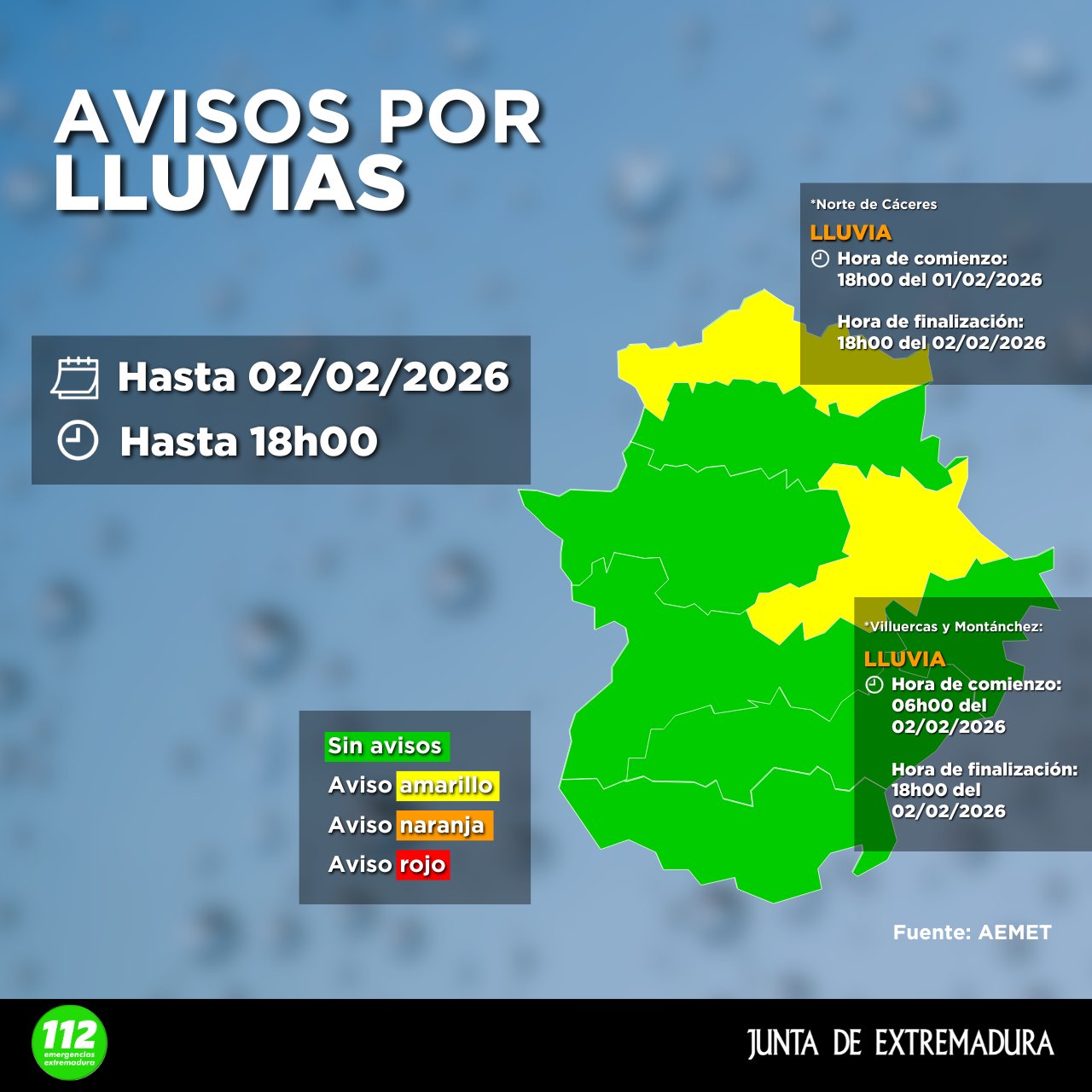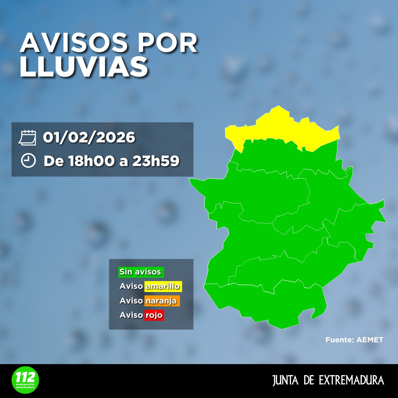 Se esperan precipitaciones intensas y rachas de viento fuertes. Se ruega extremar la precaución y seguir las indicaciones de los canales oficiales y del 112 Extremadura.