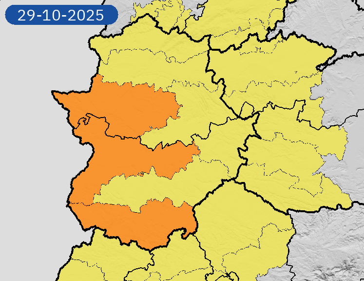 La AEMET y el Centro 112 Extremadura amplían la alerta de nivel NARANJA por lluvias, con una precipitación acumulada prevista de hasta 30 litros por metro cuadrado en una hora.