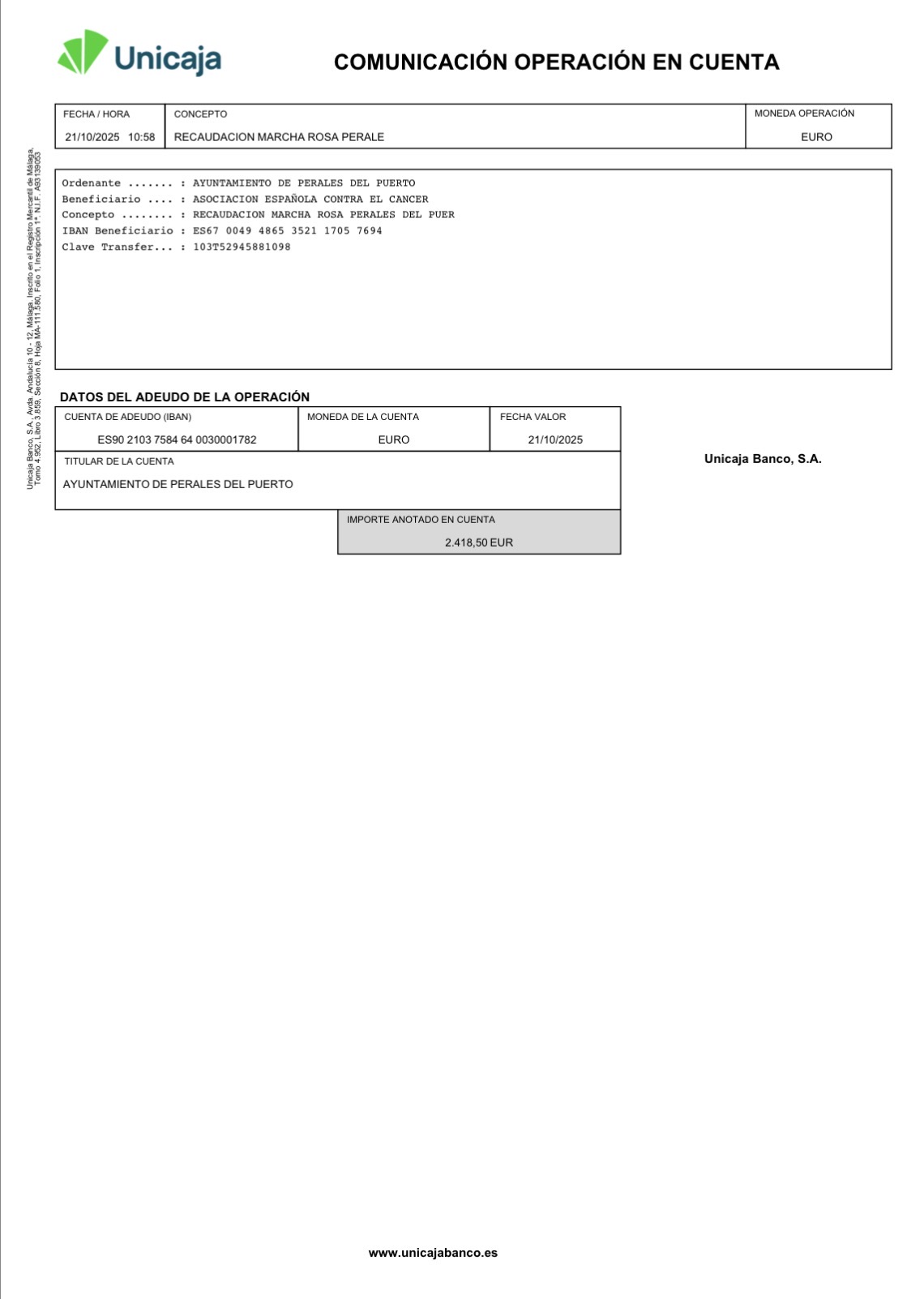 La Marcha Rosa de Perales del Puerto ha sido todo un éxito. Gracias a la solidaridad de todos y todas, se han recaudado 2.418,50 euros, cantidad que ya ha sido enviada íntegramente a la Asociación Española Contra el Cáncer (AECC).