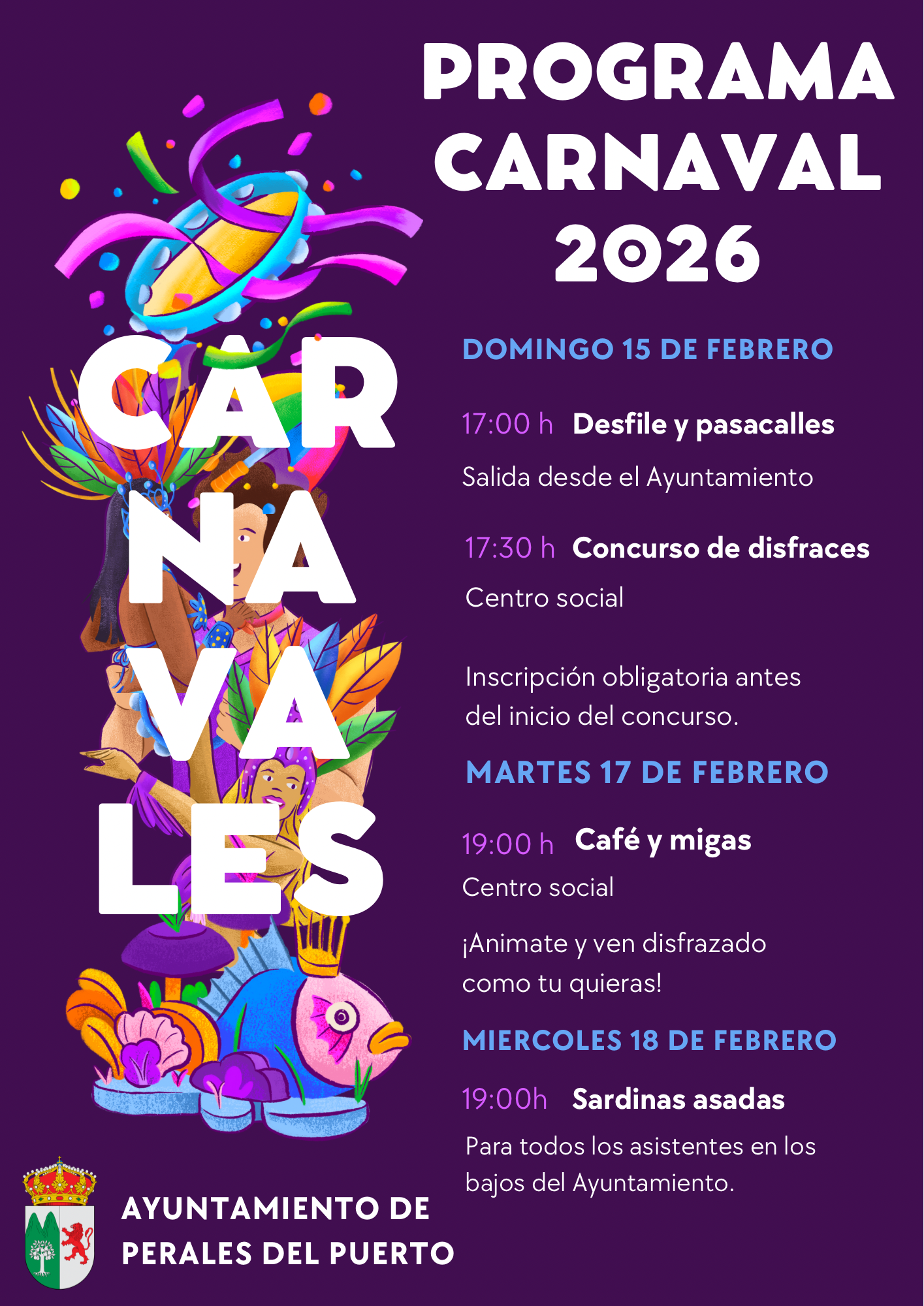 El Ayuntamiento de Perales del Puerto anima a todos los vecinos y vecinas a participar y disfrazarse en las actividades organizadas con motivo del Carnaval 2026.