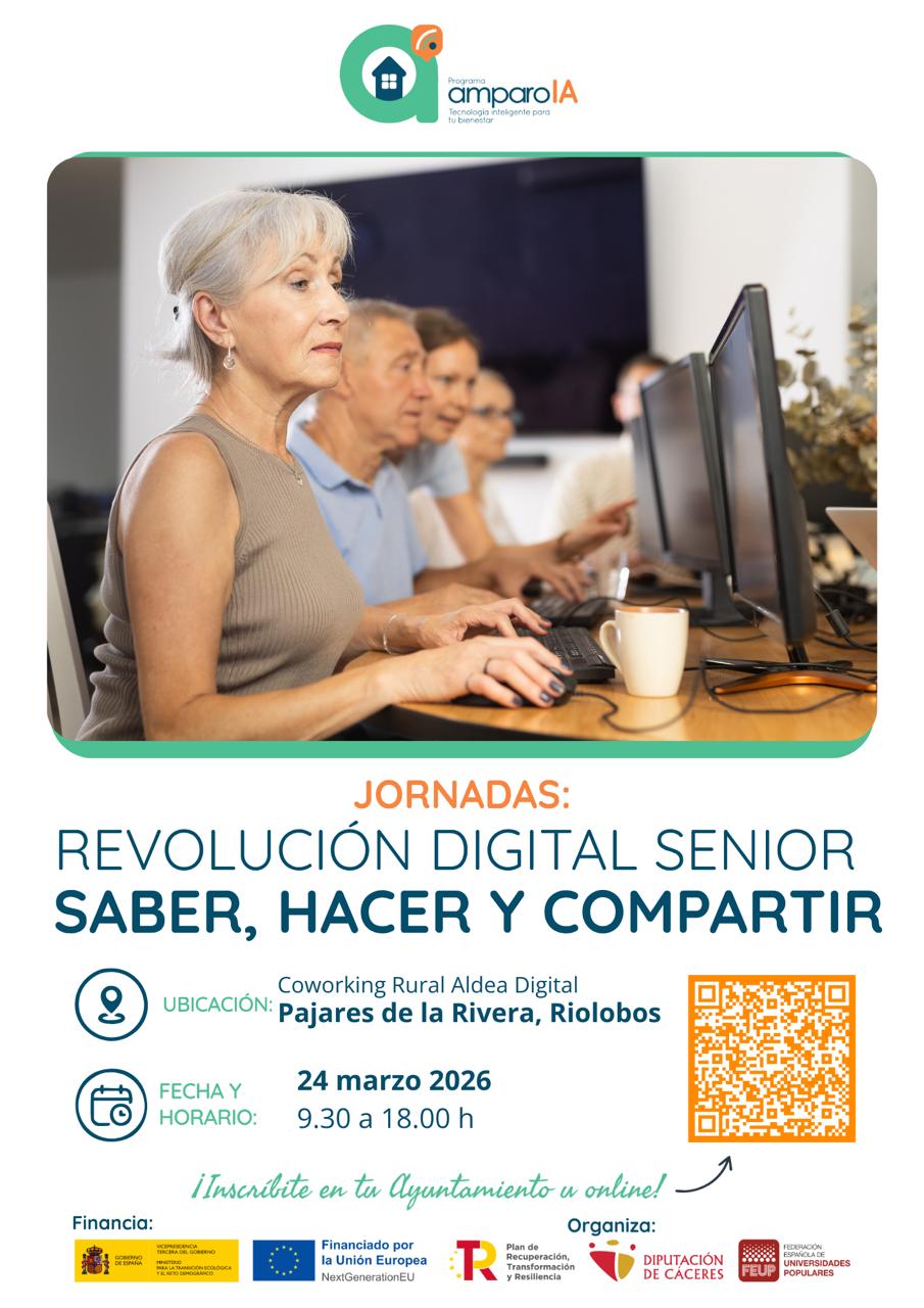 La Diputación de Cáceres en colaboración con la FEUP organiza, dentro del Programa IA Amparo - Reto Rural Digital, unas jornadas presenciales pensadas para personas mayores y para quienes quieran mejorar su relación con la tecnología de forma práctica, cercana y segura. Nos divertiremos hablando de móviles, internet, bulos, seguridad digital, inteligencia artificial y nuevas tecnologías, compartiendo experiencias reales y aprendiendo entre iguales.