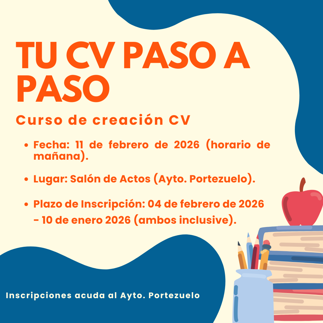 PARA TODOS LOS INTERESADOS DESDE HOY 4 DE FEBRERO HASTA EL 10 DE FEBRERO DE 2026 (AMBOS INCLUSIVE), SE ABRE EL PLAZO PARA INSCRIBIRSE EN EL CURSO “TU CV PASO A PASO”. PARA LOS INTERESADOS EN INSCRIBIRSE, PIDAN CITA EN SU AYUNTAMIENTO.