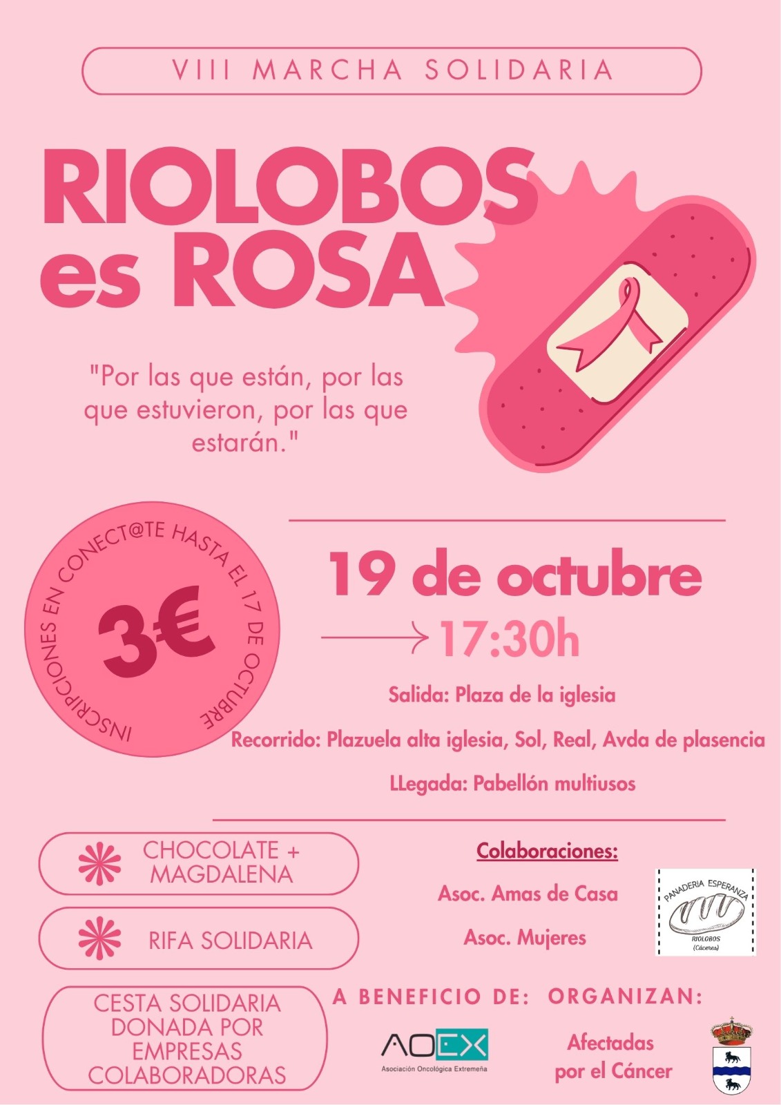 Se informa a todos los vecinos y vecinas que el domingo 19 de octubre a las 17:30 horas se celebrará la VIII Marcha Solidaria “Riolobos es Rosa”, a beneficio de la Asociación Oncológica Extremeña (AOEX).