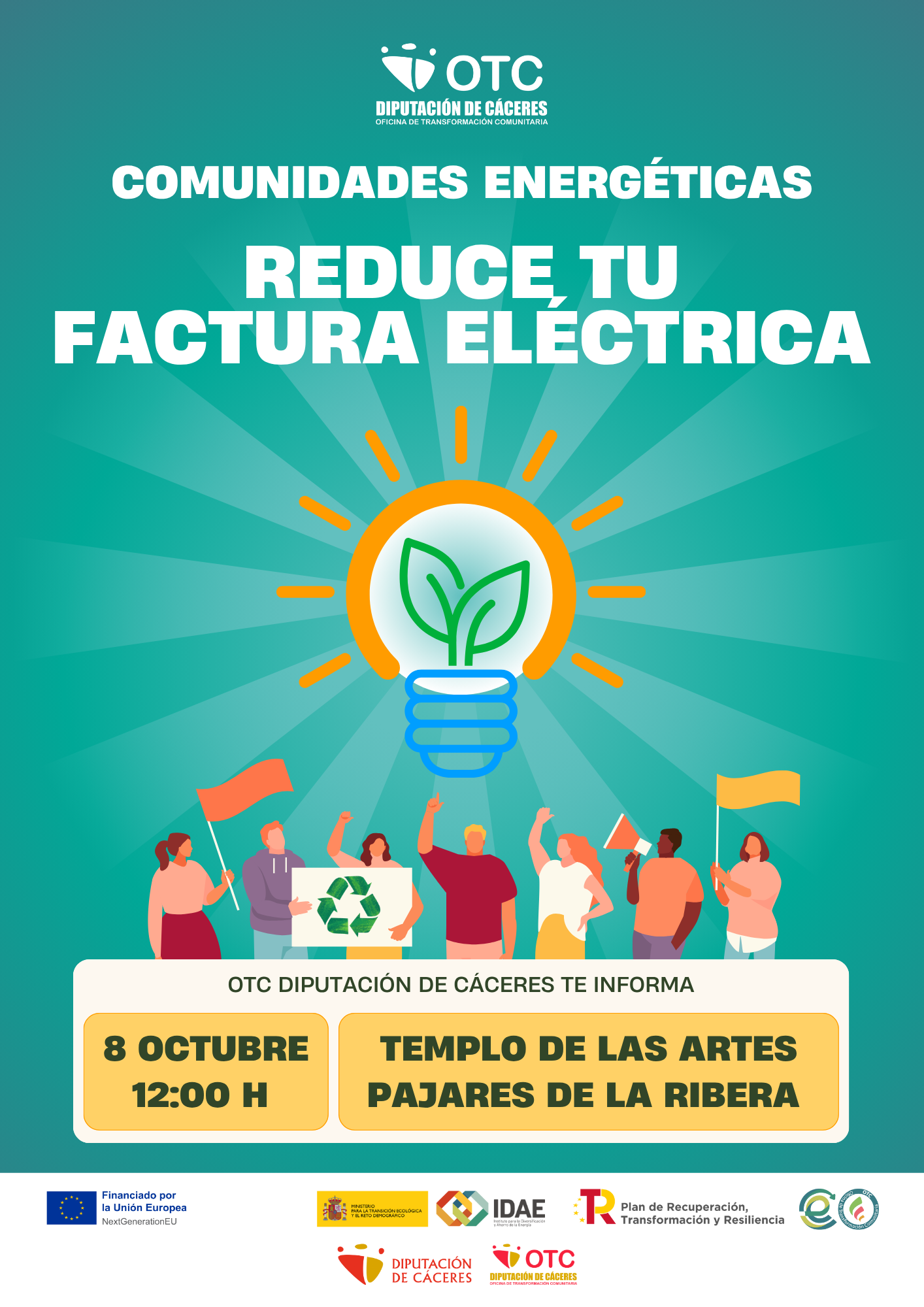 Por medio de la presente, les convocamos a una Jornada Informativa con el equipo de la OTC de la Diputación de Cáceres a celebrar el próximo día 8 de octubre de 2025 a las 12:00h en el Templo de las Artes de Pajares de la Rivera, a cualquier ciudadano/a y pymes de su localidad que pudieran estar interesados en la constitución de una comunidad energética.