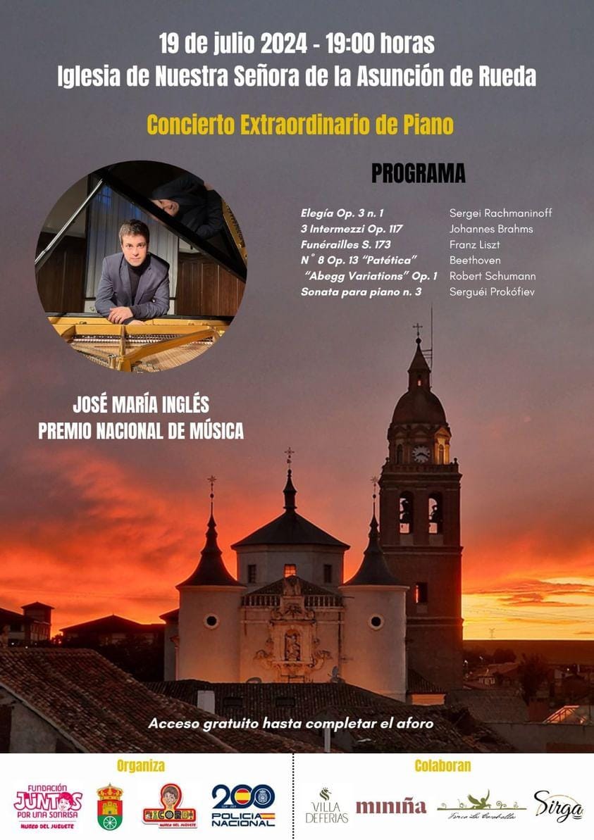 Hoy, a las 19:00 horas, en la Iglesia de Nuestra Señora de la Asunción, disfrutaremos de un magnífico concierto de piano a cargo de José María Inglés, Premio Nacional de Música. Acto organizado por la Fundación Juntos por una Sonrisa y el Ayuntamiento de Rueda.