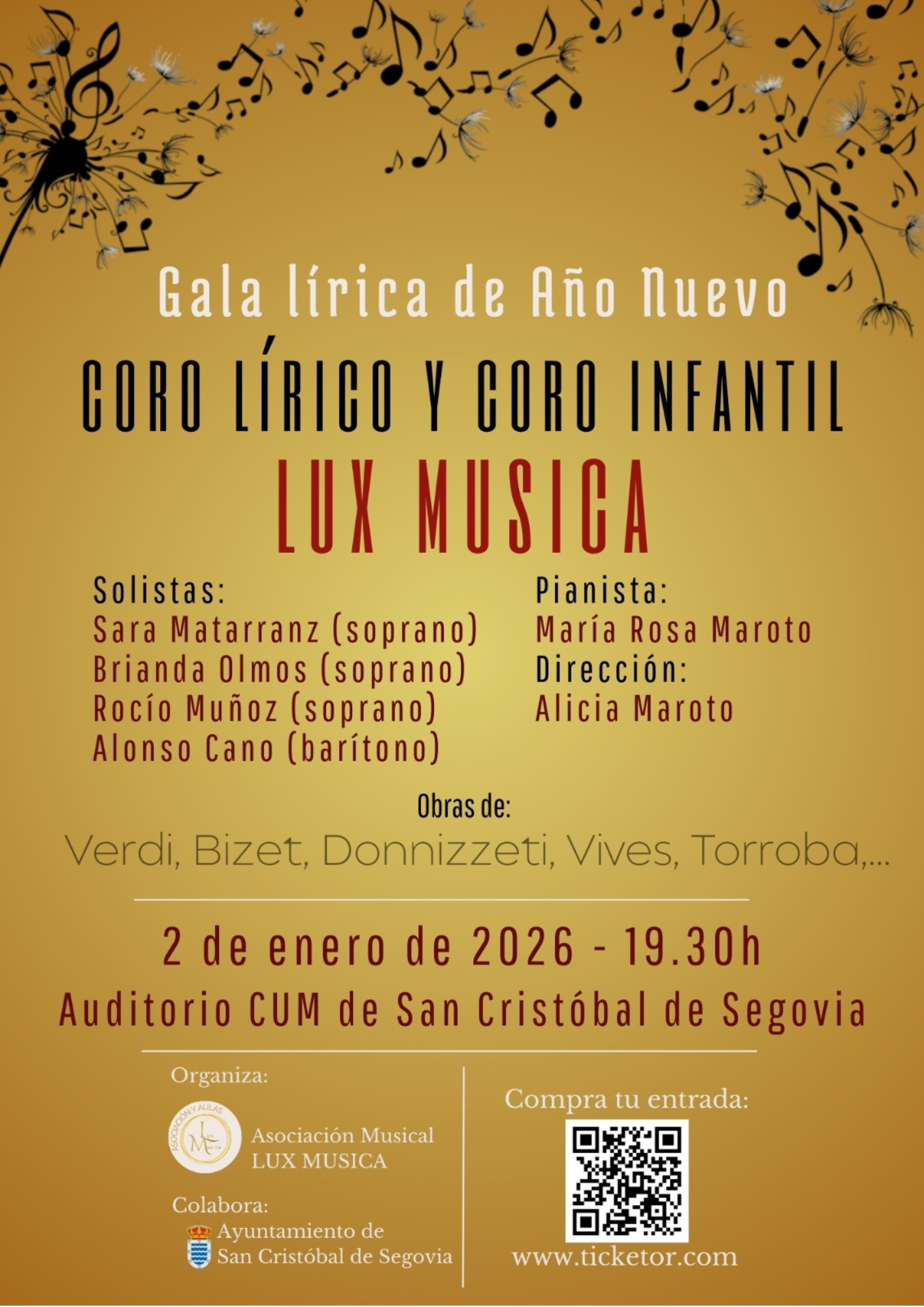 El próximo 2 de enero a las 19:30h, el Auditorio CUM de San Cristóbal de Segovia acoge la Gala Lírica de Año Nuevo, un concierto especial con el Coro Lírico y Coro Infantil Lux Musica, acompañados por destacados solistas y pianista bajo la dirección de Alicia Maroto.