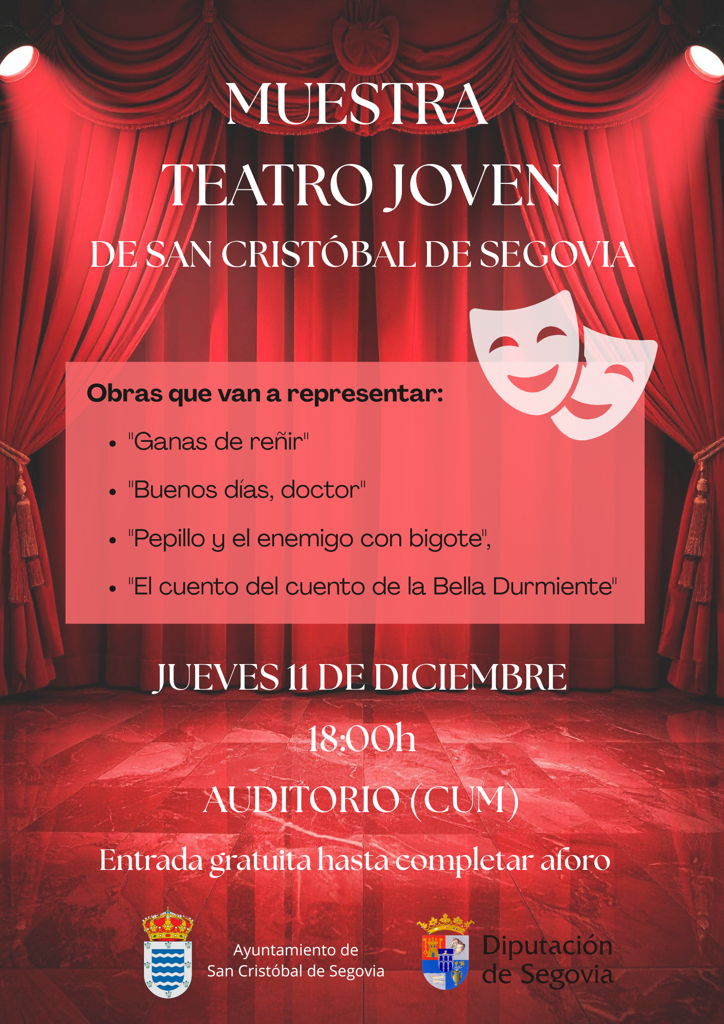 Este jueves 11 de diciembre a las 18:00h, el Auditorio (CUM) se llena de talento joven con la Muestra de Teatro Joven. Cuatro obras llenas de humor, ingenio y creatividad nos esperan: