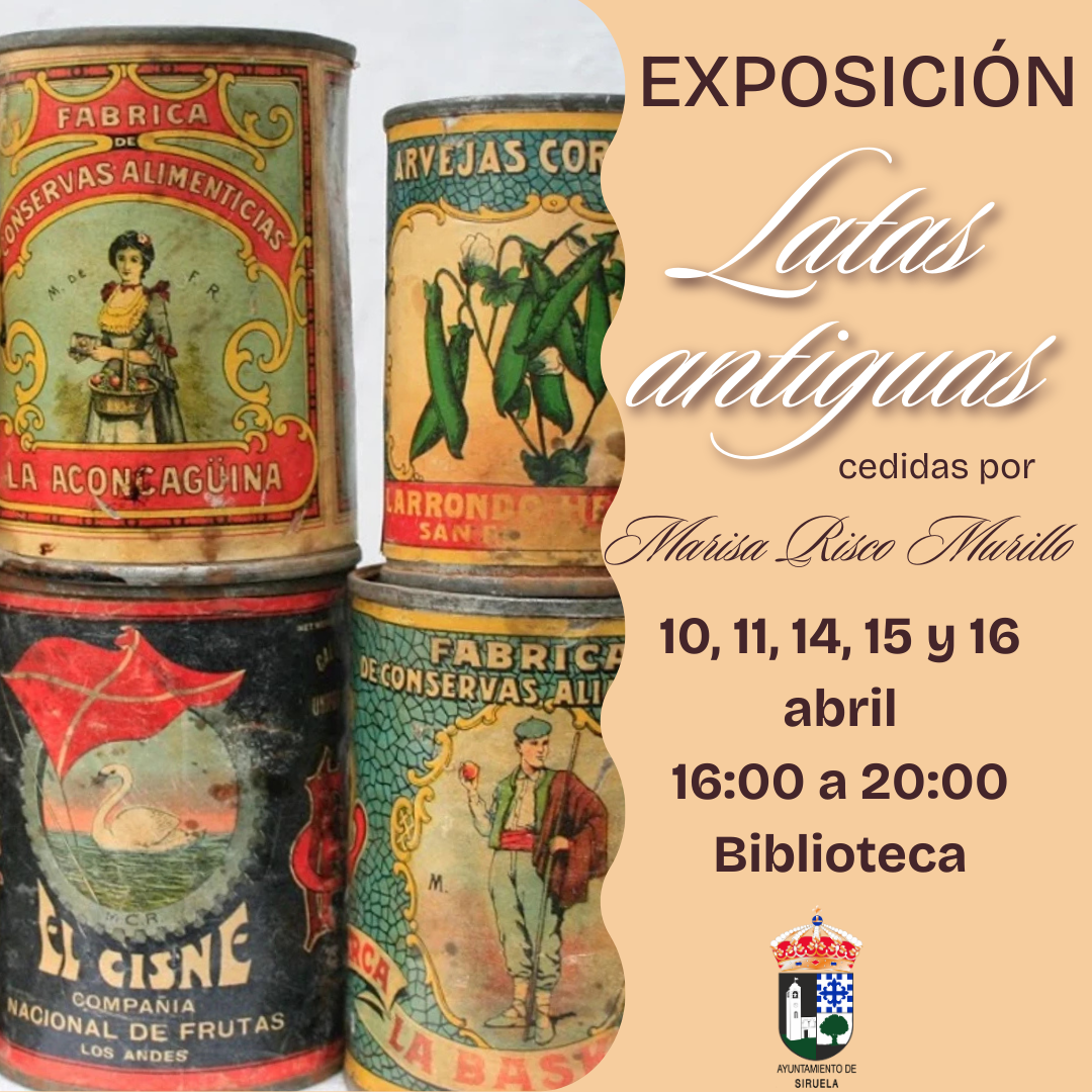 Exposición y concierto2025-04-10 10:30:00CulturaDesde esta tarde, puedes visitar en la Biblioteca, la exposición de latas antiguas cedidas por Marisa Risco.