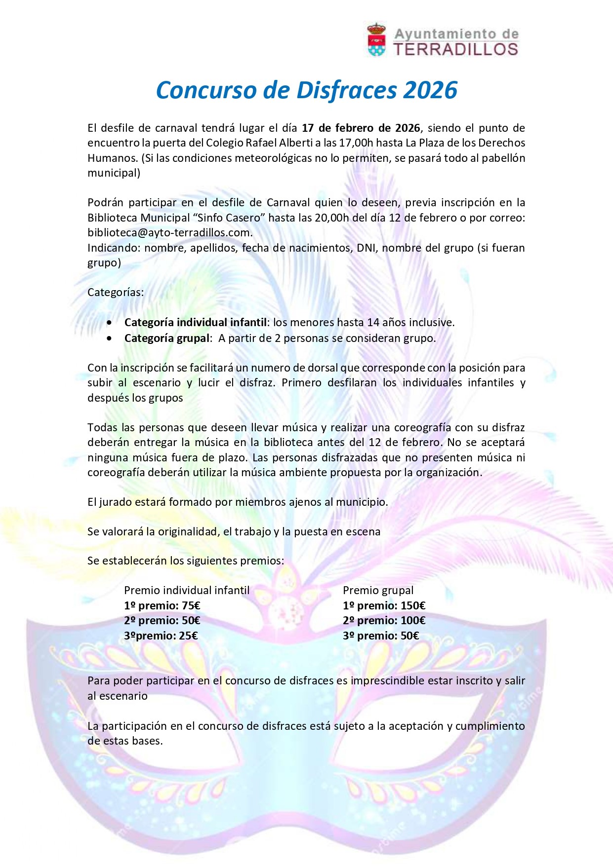 Adjuntamos las bases del Concurso de Disfraces que se celebrará el martes, 17 de febrero de 2026.